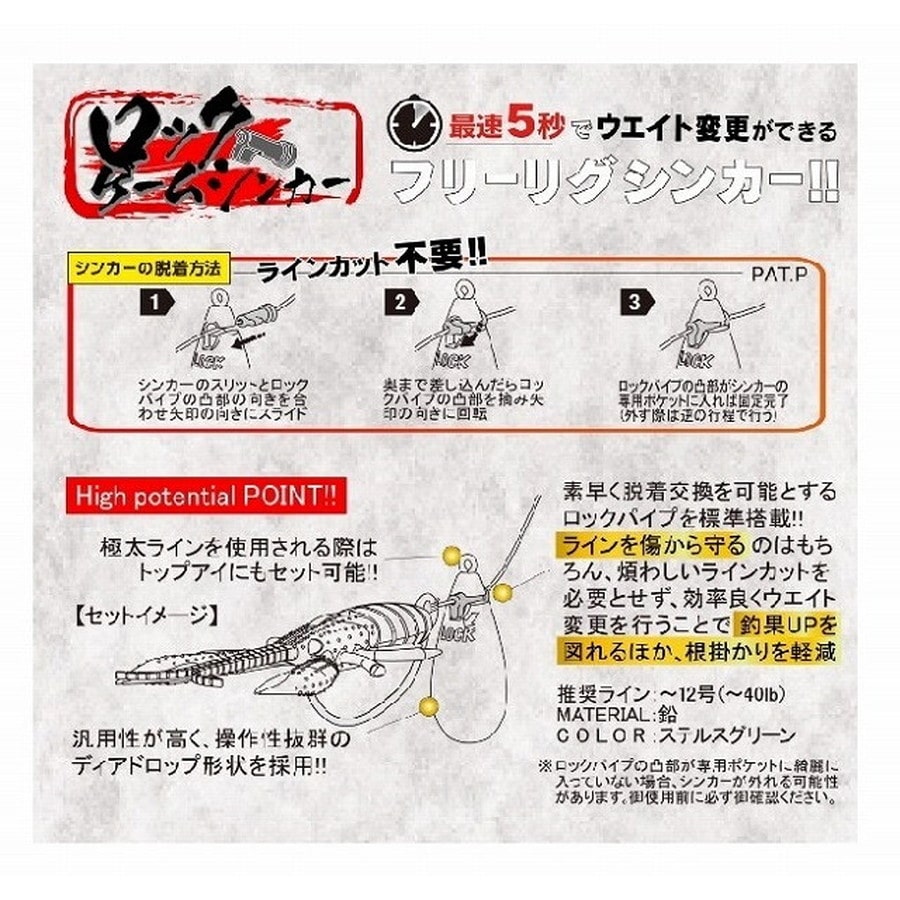 素早く脱着交換を可能とするロックパイプを標準搭載!!ラインを傷から守るのはもちろん、煩わしいラインカットを必要とせず、効率良くウエイト変更を行うことで釣果upを図れるほか、根掛かり軽減。