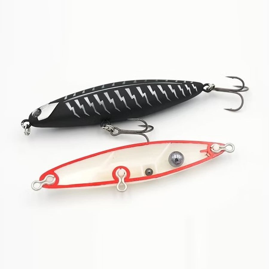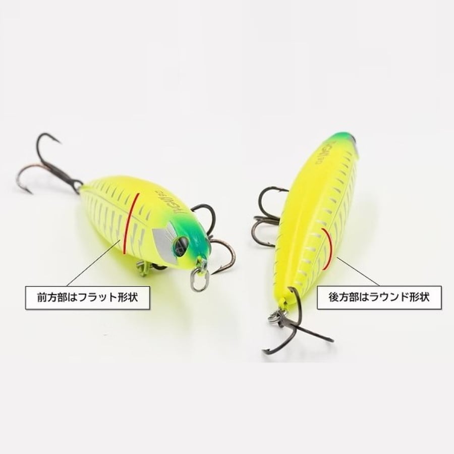 TYGANの持つ最大の能力として最も重要視したのが『圧倒的飛距離』です。本体の形状は先頭、後尾ともに滑らかな曲線かつ尖った形状で空気抵抗を最大限軽減し、後方のウェイトルーム設計は着水姿勢やアクションとのバランスを保ちながら可能な限り後方重心に設定しました。ボディ側面は前方部がフラット形状、後方部はラウンド形状となっておりアクション入力時、前方部のフラット面で水面を叩くことによってスプラッシュとポップ音が混ざった絶妙な音を奏でます。また本体のお腹部分のフラット形状でダート幅の抑制もしておりこのショートターンと、ドーム状の泡、サウンドで強くアピールするTYGAN特有のアクションが実現可能となりました。このルアーはブラックバスはもちろん、淡水・海水問わず国内外のあらゆる魚種をターゲットとしています。そのためにも強靭な顎や歯を持つ魚にも耐えられるボディの強度と太軸のフックに変更しても耐えられるエイト環、セッティングを変更しても、アクションを保持できるようなバランスで設計し、多魚種対応を可能としました。