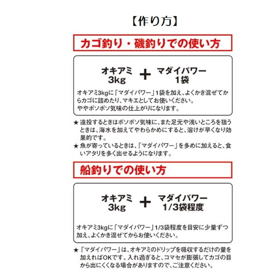 生オキアミに混ぜるだけ。寄りと、食いがぐんとよくなります。マダイの好むエビ・オキアミ・アミノ酸を含んだカゴ釣り用配合エサです。生オキアミに混ぜてご使用ください。光る成分「キララ」の視覚効果で集魚力アップが望め、さらにオキアミの変色を防ぐ効果もあります。★内容量:1000g
