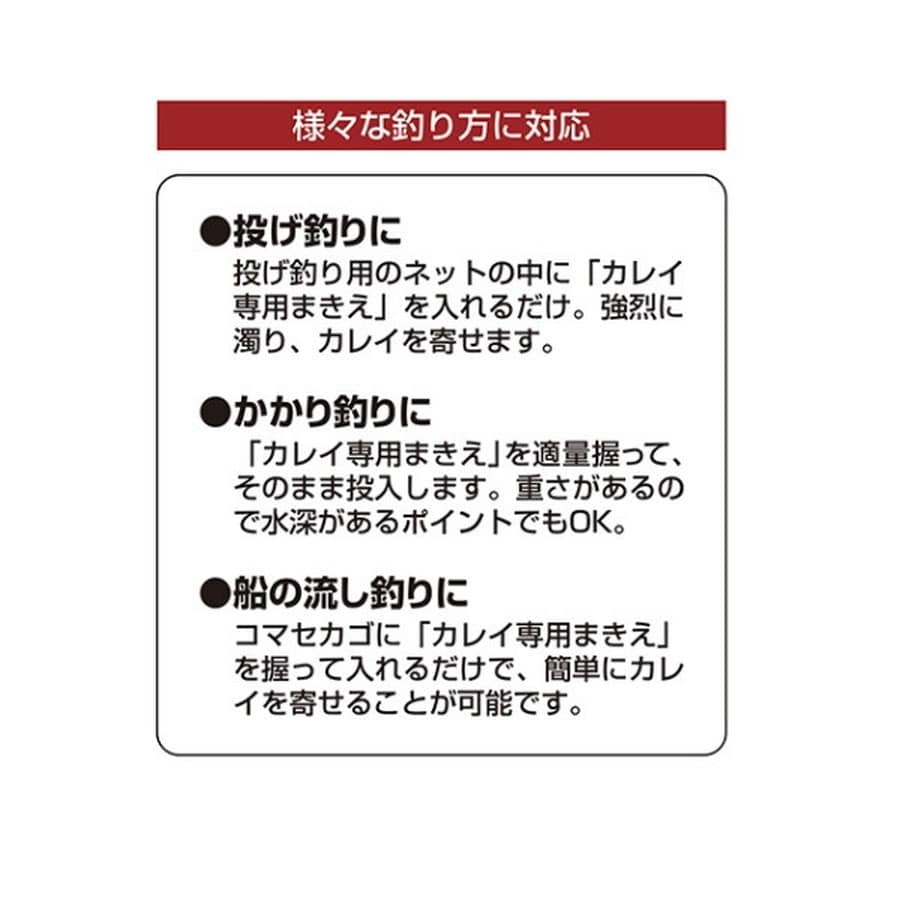 カレイの好むエビを配合。カレイの好むエビ、魚粉などを配合した、濁り重視の強力タイプ。集魚性も高く、強い底濁りの層を作ります。だからカレイの食いが立ち、時合が長続きします。重さがあるので深場狙いにも対応できます。★内容量:2500g