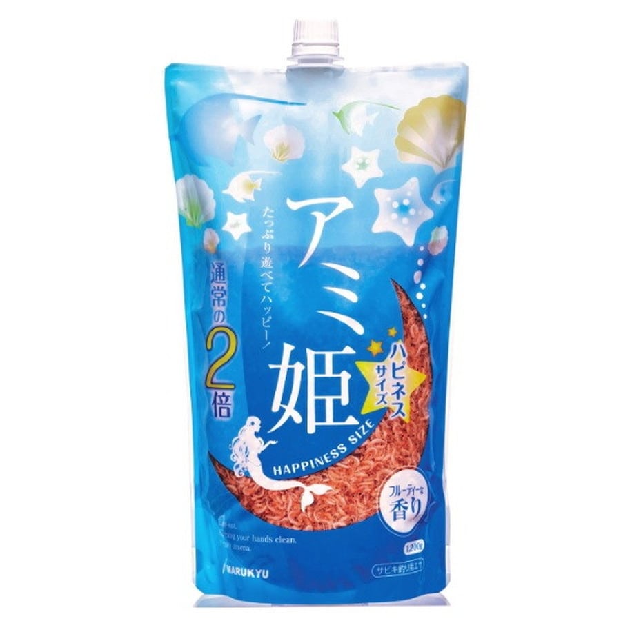 たっぷり遊べて、みんなハッピー!下カゴで50~60杯分※1、上カゴで20~22杯分※2と、たっぷり遊びたいときなどに、お得に使える2倍(1,200g) の大容量。「アミ姫」同様に粒がしっかりしたアミエビが水中でフワフワッと漂ってターゲットに猛アピール。高い集魚力を発揮し、魚の群れを足止めする効果も期待大。使い方は簡単。キャップを開けて絞り出すだけ。お子様も女性の方も手を汚さずにカゴに入れられます。さらに、フルーティーな香りで、アミエビのにおいが苦手な人もノンストレス。「アミ姫 ハピネスサイズ」はスタンドパックを採用。常温製品だからラクラク持ち運べて、スッと立って、サッと使えて超便利です。手軽な堤防・サビキ釣りの定番、アジ、サバ、イワシを狙うのはもちろん、磯、筏、船、ボートなど、本格的な釣りでアミエビをプラスしたいときにも重宝するハッピーアイテムです。※1 下カゴ:直径25mm、高さ45mm、容量約22mlの場合※2 上カゴ:直径35mm、高さ約80mmの場合★内容量:1200g