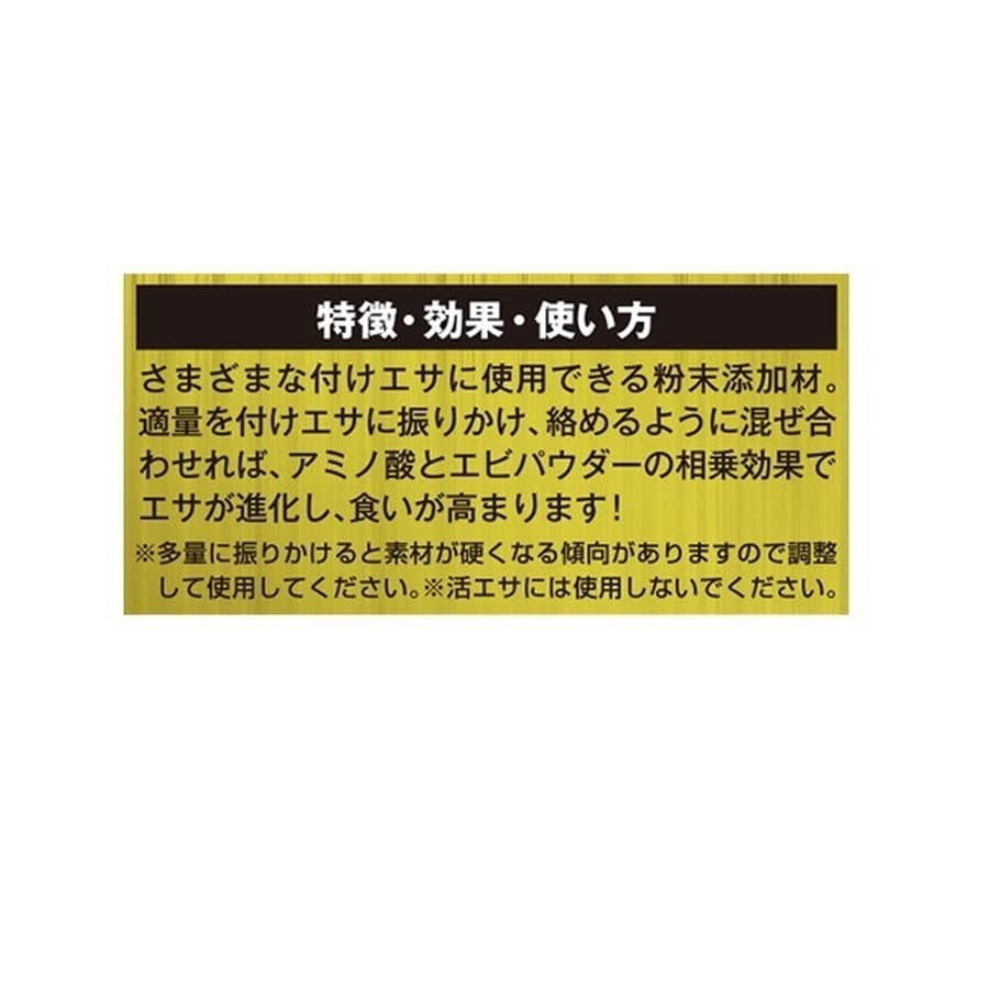 「うまみ」で差がでる大漁ボトル。魚の大好物な「うまみ」の素であるアミノ酸と、エビの『うまみ』がギュギュッと詰まったパウダー状の添加材。付けエサの摂餌力がグーンと高まり、食い込み効果がアップします。使い方は、簡単。適量を付けエサに振りかけ、絡めるように混ぜ合わせればOK。大漁ボトルなら、付けエサの量が多かったり、一度にたくさんの種類の付けエサに使用する場合などなど、キャップを開けてお好みの量をササッと使えるから便利。加工、生、ボイルなどのオキアミはもちろん、魚の切り身や、鳥のササミ、むきエビ、アサリ、コーン、さなぎなどあらゆる付けエサに使用可能。「ウマミパワー 大漁ボトル エビ」で付けエサを進化させれば、大漁も期待大。磯、波止・堤防、筏や海上釣り堀、船、ボートなど、あらゆるジャンルで付けエサを即効バージョンアップできる摂餌強化アイテムです。★内容量:80g