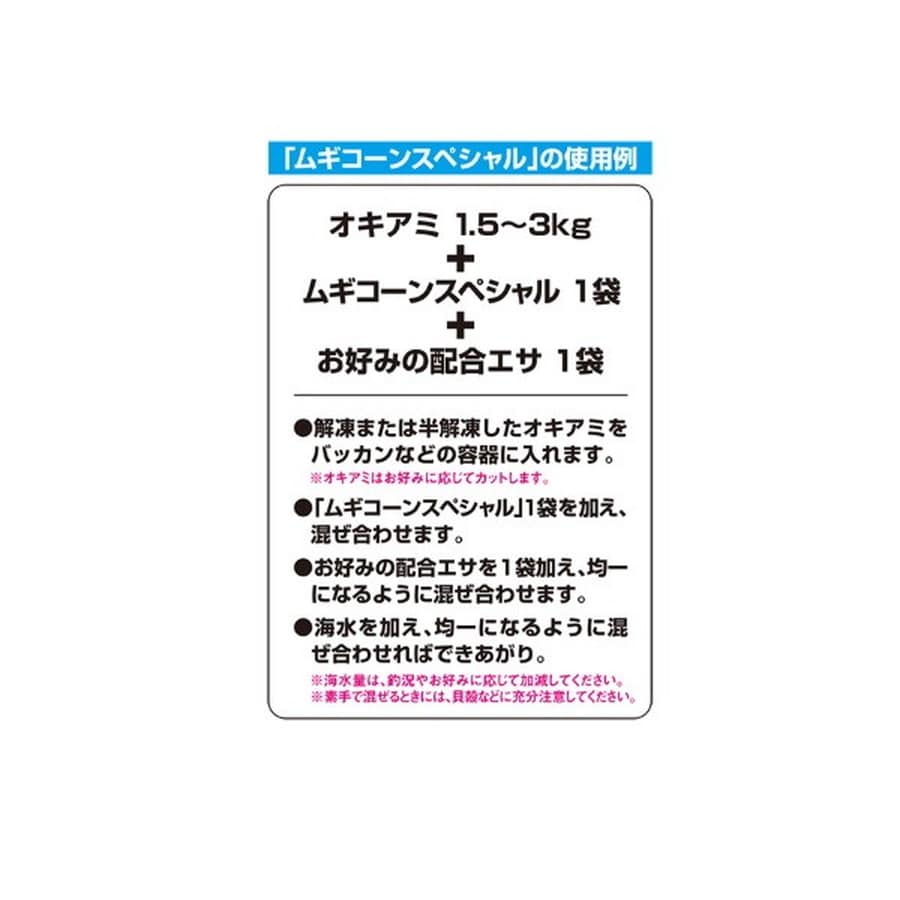 進化したブレンドエサで食いを促進。従来の「ムギコーン」の内容に、黄色の未来型(高摂餌ペレット)「M.S.P(マルキユー・シンクロ・ペレット)」をプラス。ゆっくり拡散しながらユラユラと沈降し、魚に強くアピール。オキアミと同様、違和感なくしっかりと食わせることが可能です。さらに、エサ取りに強い大粒のコーン、強烈に視覚へアピールする黄色の押しムギ、軽くヒラヒラゆっくり沈下する皮付きムギ、食いと視覚のド定番の押しムギを配合。「M.S.P」との相乗効果で、視覚集魚効果が期待できます。★内容量:400g