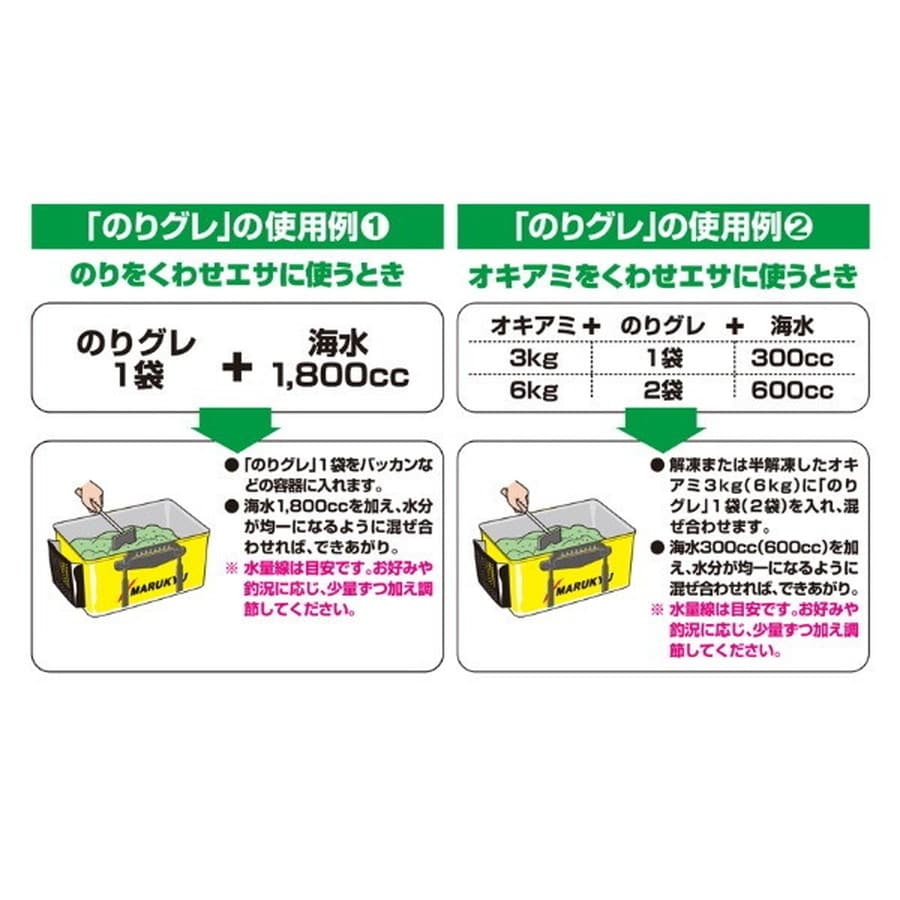 「のりグレ釣法」専用の配合エサ。付けエサにのりを用いる「のりグレ釣法」に効果的。配合されたのり、海藻、フィッシュソリブルの効果で食い気を高めます。単品でも。オキアミと混ぜてもOK。★内容量:1000g