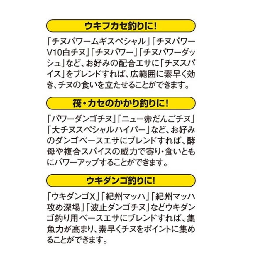 「複合スパイス&酵母」で強力集魚。ニンニクをはじめとして酵母、センキュウ、さなぎなどの複合スパイスを配合した強力集魚タイプ!釣り場の釣況に合わせてブレンドすれば、チヌを刺激し活性を高めます。★内容量:1300g
