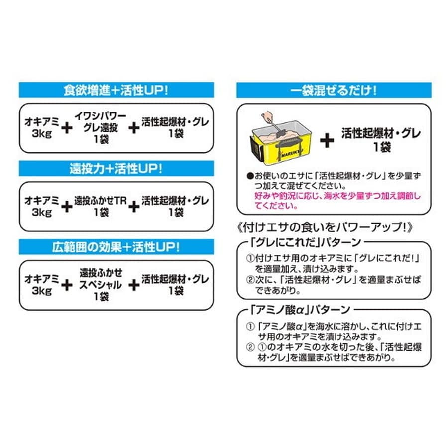 グレの食い気を誘発!遠投性もアップ。気温・水温の変化などでグレの活性が下がり、食いが渋いときに加えるとグレの活性を高め、食いをたたせる添加用配合エサです。さらに、まとまりをよくして遠投性を高めることができます。★内容量:500g