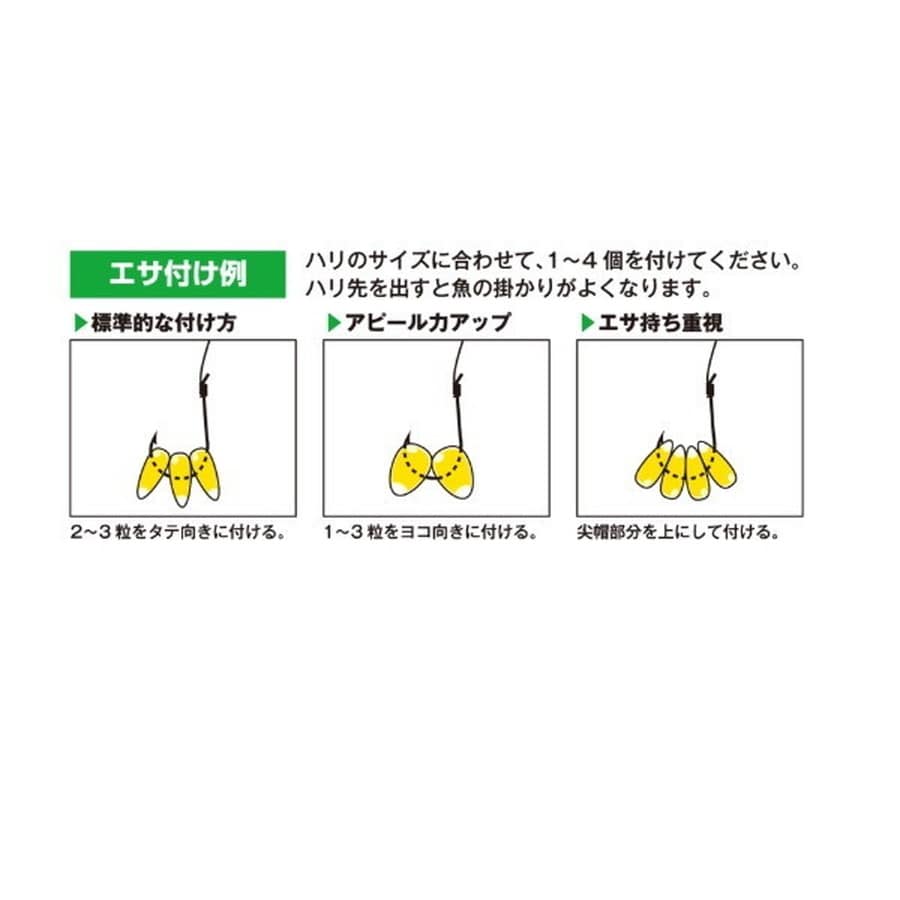 やわらかいので自然な食い込み。ソフトな仕上がりで食い込みのいいくわせ用コーン。エサ取り対策に効果的な尖帽と、栄養価の高い胚芽を手もぎによりまるごと残しました。魚が好む成分であるアミノ酸も添加し、摂餌効果をさらに高めています。★内容量:100g