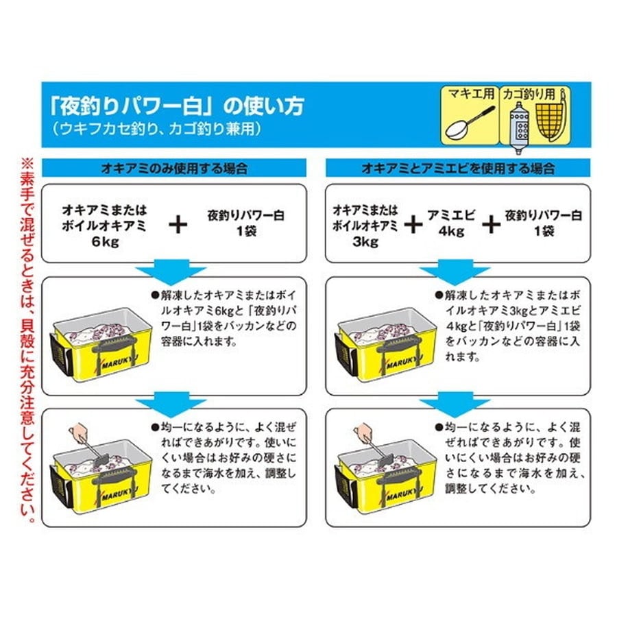 白さが強みの、夜釣り専用配合エサ。視認性の高い、白い配合エサ。夜でも、エサ作り、カゴ入れ、マキエワークなどがしやすくなっています。輝きでアピールする素材『キララ』を配合。白さと輝きの相乗効果により、夜釣りでも集魚力を発揮します。生オキアミ、アミエビはもちろん、ボイルオキアミとのブレンド性も良好。●イサキ、大アジ、グレ、シブダイを狙う、カゴ釣り、フカセ釣りに活躍します。★内容量:1500g