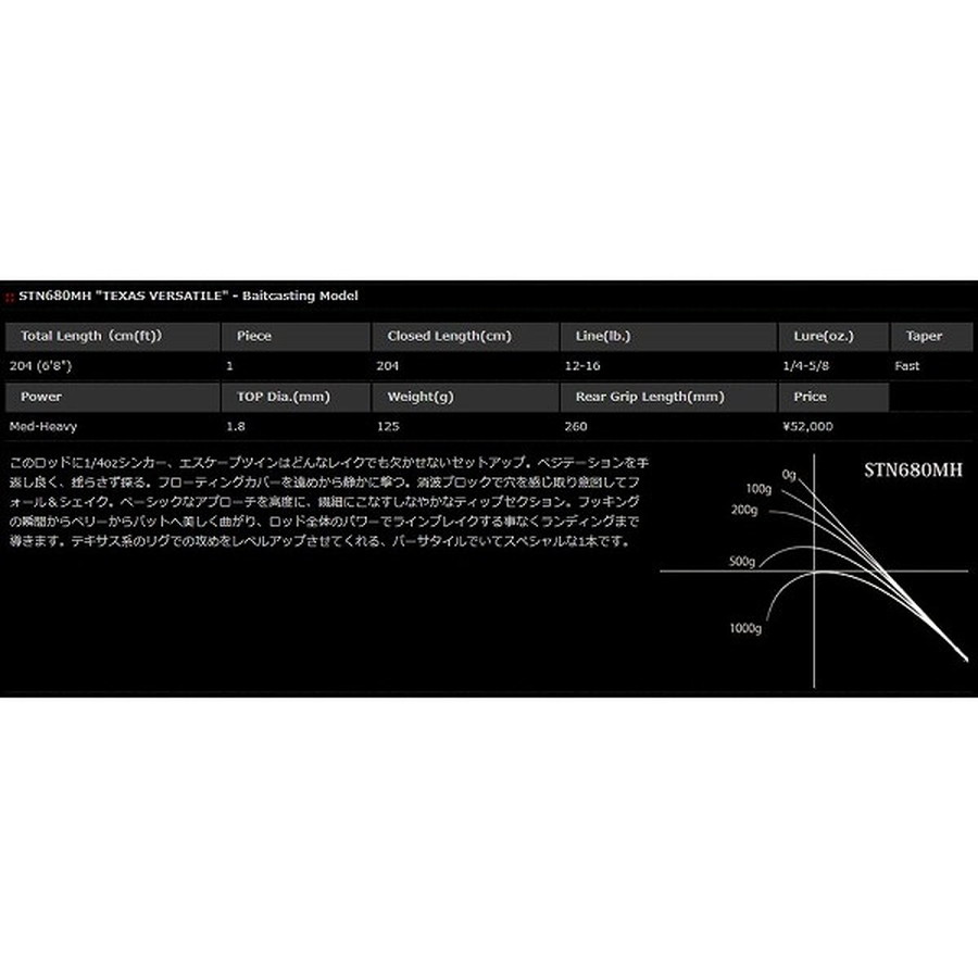 Total Length(cm(ft)):204 (6’8”) Line(lb.):12-16 Lure(oz.):1/4-5/8 Taper:Fast Power:Med-Heavy Weight(g):125