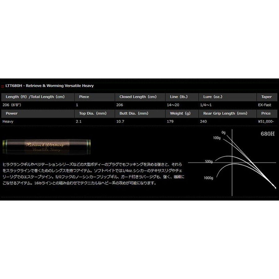 ヒラクランクギルやベジテーションシリーズなどの大型ボディーのプラグでもフッキングを決める強さと、それらをスラックラインで巻くためのレングスを持つアイテム。ソフトベイトでは1/4oz.シンカーのテキサスリグやチェリーリグでのエスケープツイン。5/0フックのノーシンカーフリップギル、ガード付きラバージグも、強く、繊細にこなせるアイテム。16lbラインとの組み合わせでテクニカルなヘビー系の攻めが可能になります。