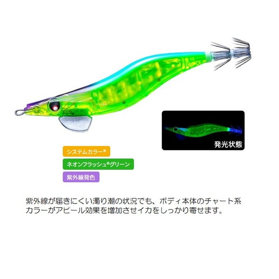 キレのいい「スライディングダート」は好奇心旺盛な秋イカに効果的!!今までにない急角度で左右に繰り出される「スライディングダート」によって、3Dレンズで倍増されたインナーシートの輝きを全方向へ拡散する事で広範囲のイカを引き寄せる!!★号数:3.0