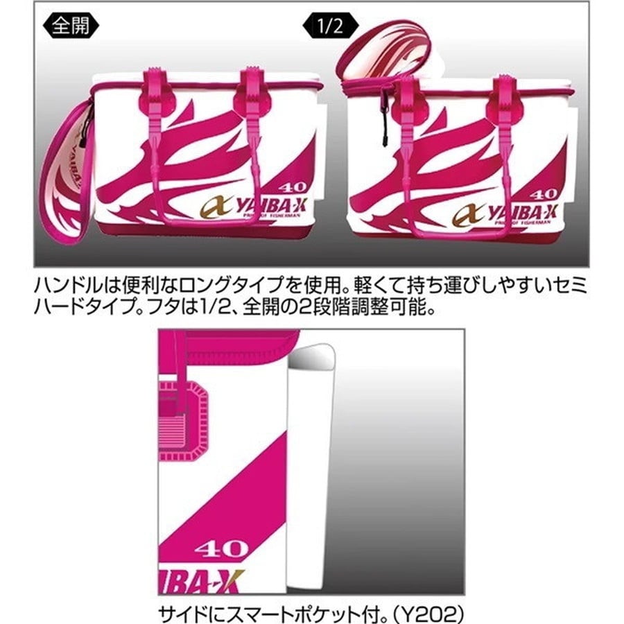●ヤイバウルフバッカンにピンクスペシャルが登場!●ハンドルは便利なロングタイプ。軽くて運びやすいセミハードタイプ。●フタは1/2と全開の2段階調節可能。●Y202(40cm)はサイドにスマートポケット付。