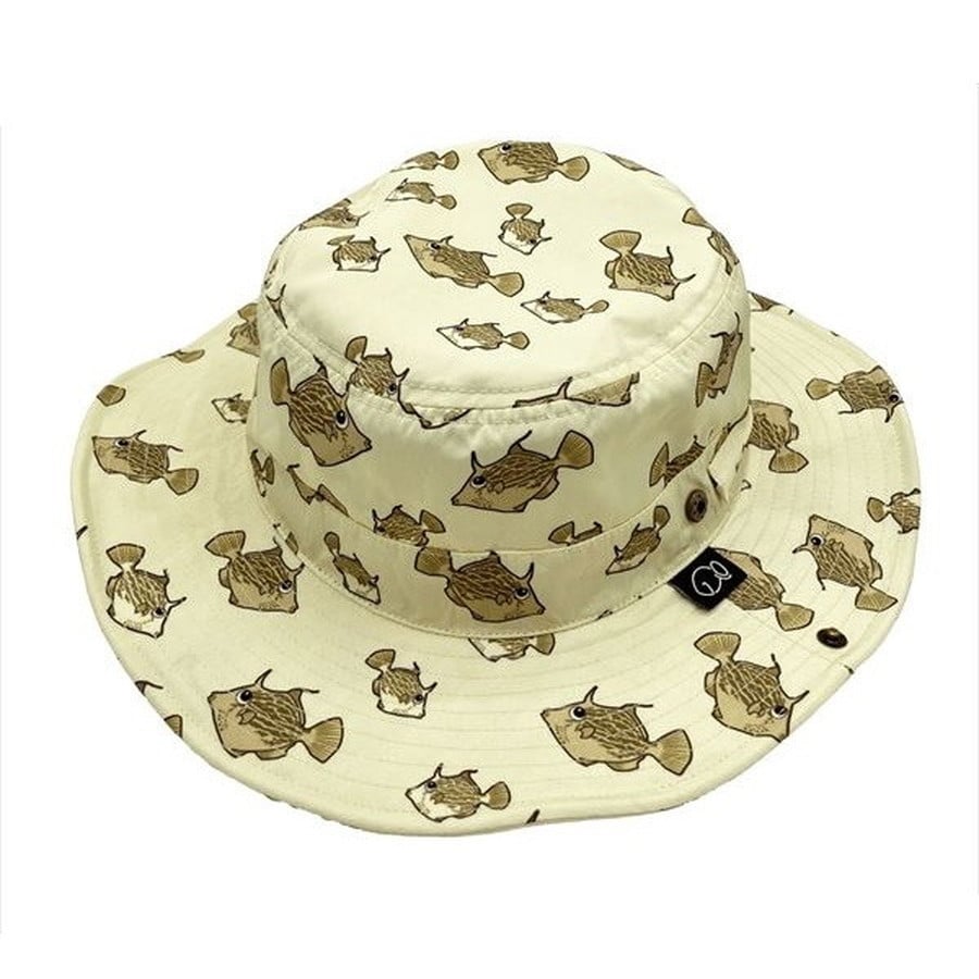 カワハギのイラストを帽子全体にプリントした可愛いギョギョハット。●撥水加工を施しているので水しぶきや雨を弾きます。●紫外線防護係数=UPF50+●つばの縁にワイヤー入りでお好みの角度に調整可能。●ホック付きでつばを固定できます。●あご紐付き