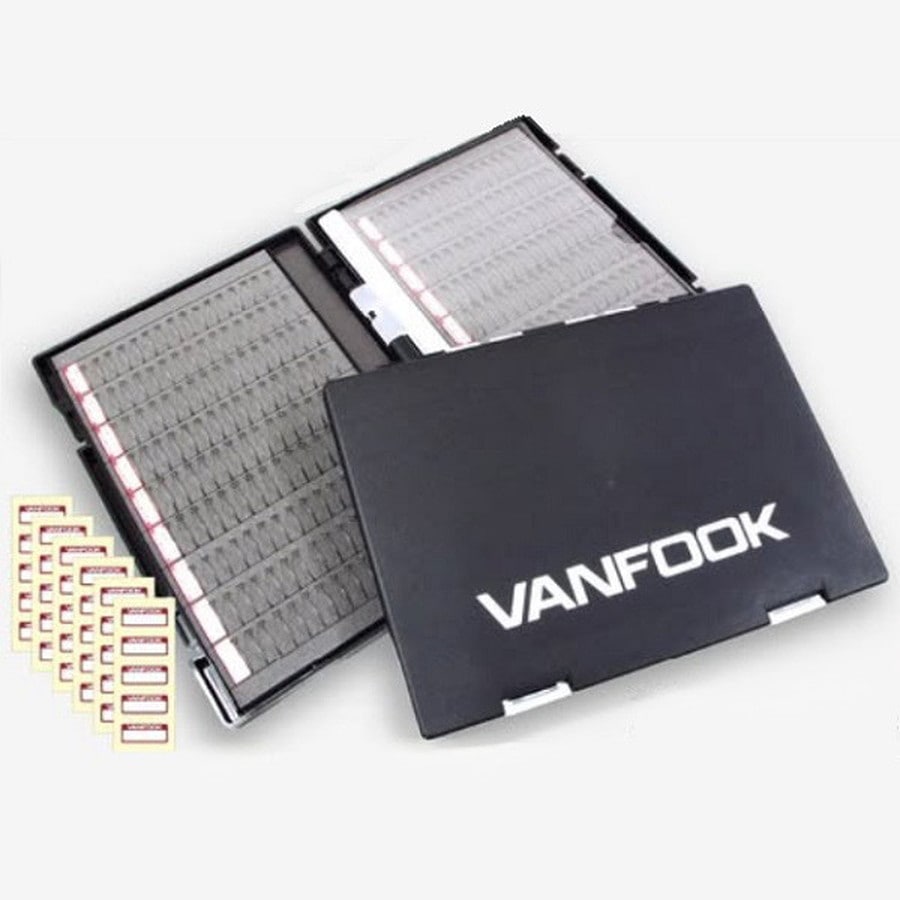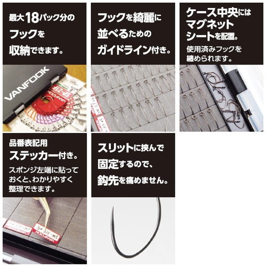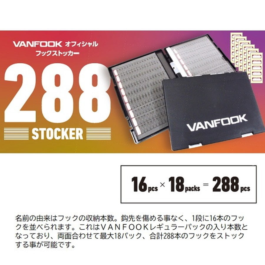 名前の由来はフックの収納本数。鈎先を傷めることなく、1段に16本のフックを並べられます。これはVANFOOKレギュラーパックの入り本数となっており、両面合わせて最大18パック。合計288本のフックをストックすることが可能です。