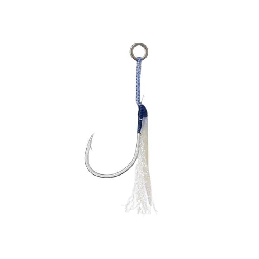 魚皮+ティンセルで強烈アピール!天然魚皮とオーロラスレッドを丁寧にタイイングし、更にその上から特殊塗料「ケイムラ」でコーティングしたシングルアシストモデルです。最大の特長は、紫外線に反応してまばゆいばかりに発光するその圧倒的なアピール力にあります。特に光の届きにくい深場や、濁りのある状況下においても高い集魚力で青物をはじめ様々なターゲットを魅了します。アシストフック自体がアピールとなり、ベイトが極めて小さく食わせにくい「シラスベイト」のような状況下においても有効です。キャスティングジグとの相性も抜群で、特にカツオ狙いに最適です!