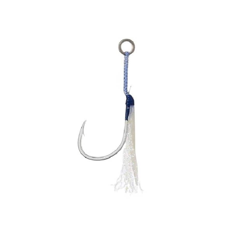 魚皮+ティンセルで強烈アピール!天然魚皮とオーロラスレッドを丁寧にタイイングし、更にその上から特殊塗料「ケイムラ」でコーティングしたシングルアシストモデルです。最大の特長は、紫外線に反応してまばゆいばかりに発光するその圧倒的なアピール力にあります。特に光の届きにくい深場や、濁りのある状況下においても高い集魚力で青物をはじめ様々なターゲットを魅了します。アシストフック自体がアピールとなり、ベイトが極めて小さく食わせにくい「シラスベイト」のような状況下においても有効です。キャスティングジグとの相性も抜群で、特にカツオ狙いに最適です!