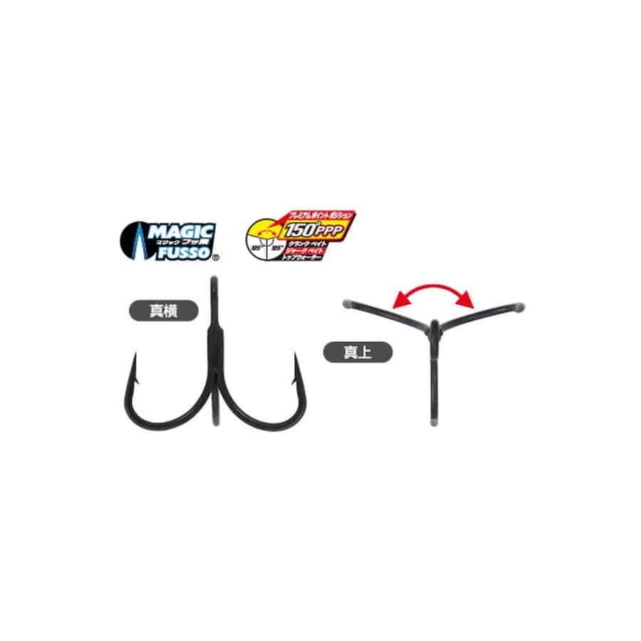 PPP(プレミアムポイントポジション)1番フックと3番フックの間を150度に広げることで、バランスを保ちながらフックの可動域を増やし、フッキング率向上 ショートシャンク設計 1リトリーブ時における前後のフック干渉、ルアーへの絡みを防ぐ2フックウエイトが軽くなるため、1サイズ大きなフックを使用できる 驚異の貫通性能 1リアクションによるショートバイトを掛ける鈎先形状2摩擦抵抗を最大限に抑えるマジックフッ素※掲載している商品の画像は代表画像を表示しています。また実物と色が違って見える場合があります。あらかじめ