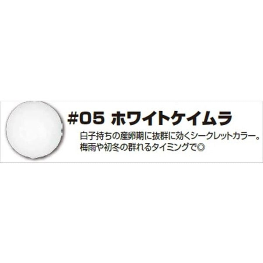 底とりがしやすく、潮切れ抜群の丸錘タイプ。潮が速いエリアにおすすめです。#05 ホワイトケイムラ 白子持ちの産卵期に抜群に効くシークレットカラー。梅雨や初冬の群れるタイミングで◎※掲載している商品の画像は代表画像を表示しています。また実物と色が違って見える場合があります。あらかじめご了承下さい。