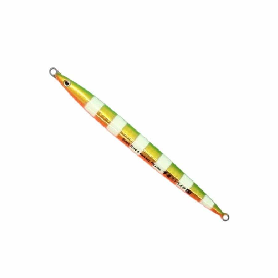 ただ頑強なだけじゃない。大型青物迎撃ロング。1,変型防止のステンレス鋼板「タフボーン」内蔵です。ワイヤーではありません。2,塗装は耐衝撃仕様です。磯にぶつかった箇所のみが凹むことを目指しています。3,「スライド」→「浮遊」→「水平フォール」の移行がスムーズです。通常のジグよりも大型青物に見切られることなくバイトを得やすくなっています。4,ジグのエッジに丸みを持たせ、フォール時のスライスを排除。フォールから着底までの迅速さはシリーズ最速です。150グラムなら激流帯ではプラス30グラムのフォール感覚です。5,飛距離へのこだわりは撃投シリーズ15年の蓄積。飛行姿勢(=飛距離)はロングジグでは類を見ない感覚です。