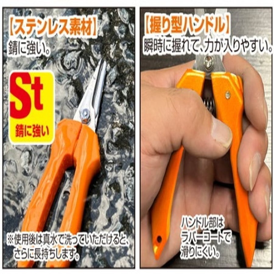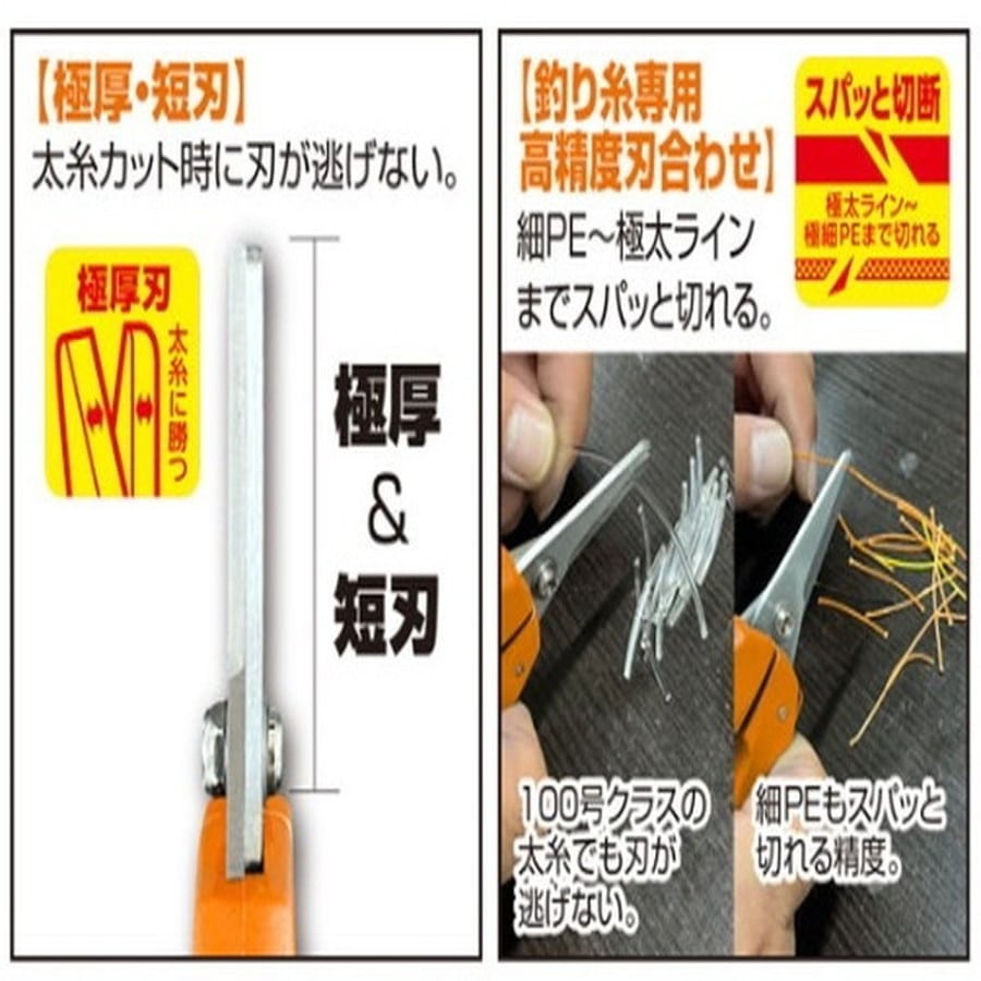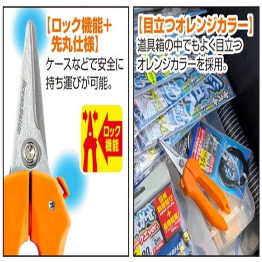 ニッパー級の剛性+刃の切れ味!!【極厚・短刃】太糸カット時刃が逃げない。【釣り糸専用高精度刃合わせ】細PE~極太ラインまでスパッと切れる。【ステンレス素材】錆に強い。【握り型ハンドル】瞬時に握れて、力が入りやすい。ハンドル部はラバーコートで滑りにくい。【ロック機構+先丸仕様】ケースなどで安全に持ち運びが可能。【目立つオレンジカラー】道具箱の中でもよく目立つオレンジカラーを採用。