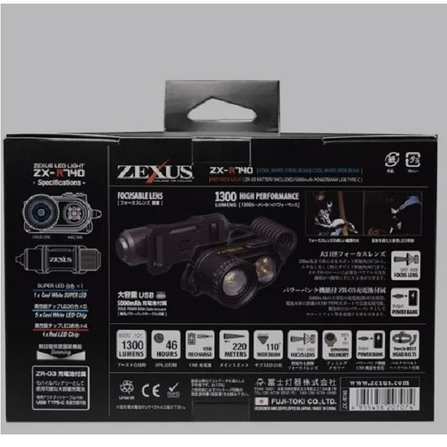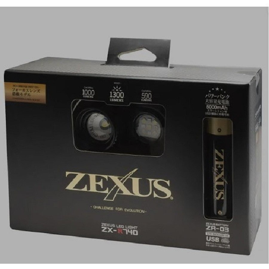 ZEXUSの新たなフラッグシップ「ZX-R740」は最大値1300ルーメンを達成。フォーカスコントロールレンズを搭載したシングル照射でも驚異の1000ルーメンを超え、圧倒的な明るさを誇ります。そしてこの明るさを支えるために新たに採用した「ZR-03」は超大容量の5000mAh。明るさと長時間使用の両方に対応しました。また、サブLEDには赤色の高性能チップLED4灯を搭載し、テクニカルなナイトゲームをサポートします。★使用光源:HIGH POWER LED 白色 × 1 高性能チップ LED 白色 × 5 高性能チップLED 赤色 × 4 明るさ:約1300ルーメン(メイン白色LED+白色LED5灯 ブースト時) 使用電池:ZR-03 リチウムイオン充電池 ZR-02 リチウムイオン充電池 点灯時間:メインLED:実用点灯 約46時間(10%時) メインLED:実用点灯 約9.5時間(100%時) サブLED:実用点灯 約17.5時間(白色LED100%時) サブLED:実用点灯 約10時間(赤色LED100%時) 照射距離:約220m 本体サイズ:約 幅70×高さ42×奥行37mm(本体) 約 幅102×高さ39.5×奥行34.5mm(バッテリーケース) 本体質量:約145g(電池別) 防水性能:IPX4相当
