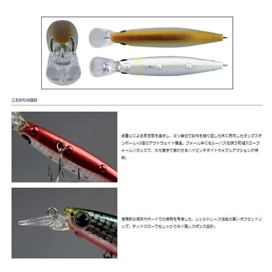 計算し尽くされた形状とウエイトバランスの相乗効果で、より低速域からアクションし始め、通常のリトリーブスピードでは極力タイトかつ力強いアクションを発生させる。そのまま高速域までリトリーブスピードを上げても大振りなアクションになることなく安定したレンジトレースが可能。また、低速域高速域まで幅広いスピードに対応する上、独特のリップ形状はやや足場の高いフィールドでもしっかりと水を捉え有効レンジをキープ。重要なのはリトリーブ中のロッドにアクションの振動が伝わらないスピードでもミノーがアクションしていること。その絶妙なスピード域を港湾や都市型河川といったフィールドに合わせることで、このミノーはネオスタンダードとして絶大な威力を放つだろう。