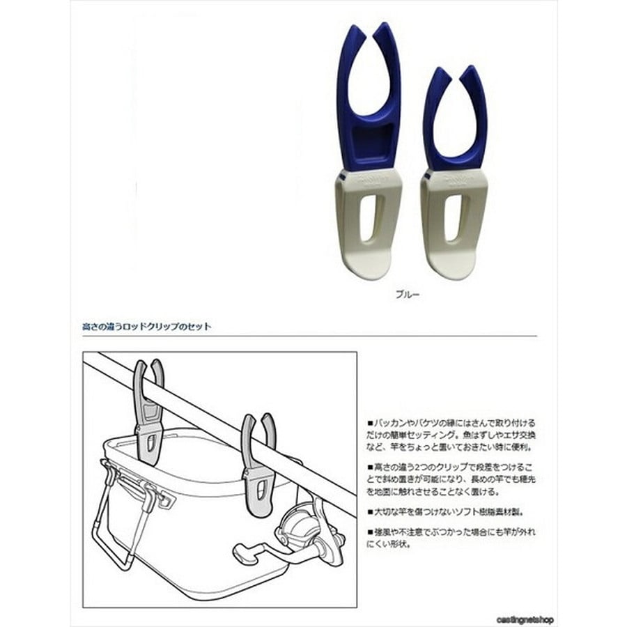★高さの違うロッドクリップのセット ■バッカンやバケツの縁にはさんで取り付けるだけの簡単セッティング。魚はずしやエサ交換など、竿をちょっと置いておきたい時に便利。■高さの違う2つのクリップで段差をつけることで斜め置きが可能になり、長めの竿でも穂先を地面に触れさせることなく置ける。■大切な竿を傷つけないソフト樹脂素材製。■強風や不注意でぶつかった場合にも竿が外れにくい形状。
