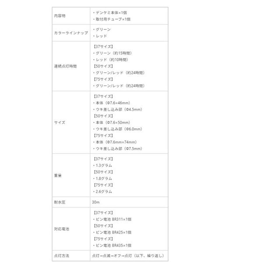 LED式ウキトップライト「デンケミ」の電池交換タイプが登場!更に使い易くなったウキトップライトの決定版。お手持ちのケミホタル対応ウキにそのままセット可能。専用チューブで仕掛けに取り付けて簡易的な水中集魚ライトにも!