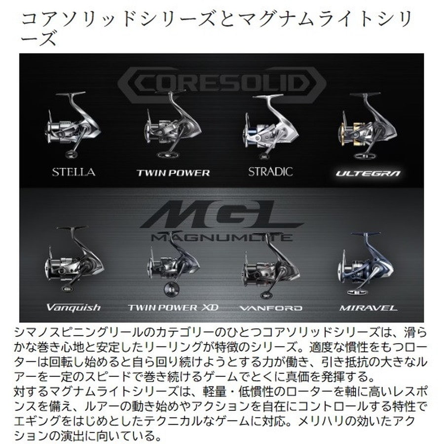 ULTIMATE EVOLUTION。価格帯の常識を超える回転性能と耐久性を装備し、多くのアングラーに人気のアルテグラ。より滑らかで安定した巻きを追求したコアソリッドシリーズの設計は、バイブレーションプラグなど引き抵抗の大きなルアーを一定速度で巻き続ける釣りにおいてとくにその真価を発揮。インフィニティクロス、インフィニティドライブ、アンチツイストフィンの追加でさらにレベルアップした基本性能は、エントリーユーザーはもちろんコアユーザーにも納得の使い勝手に仕上がっている。■2500・・・ライトなオールラウンダー。ナイロン3号120mのラインキャパで、各種ルアーフィッシングからウキフカセやチョイ投げなどのエサ釣りまで多彩な魚種や釣法に対応可能なモデルです。