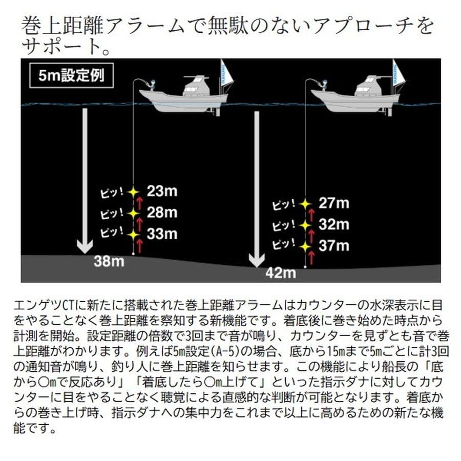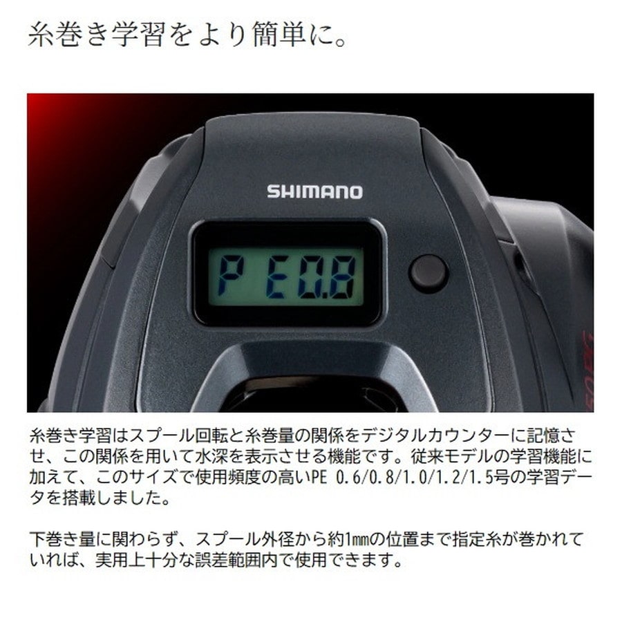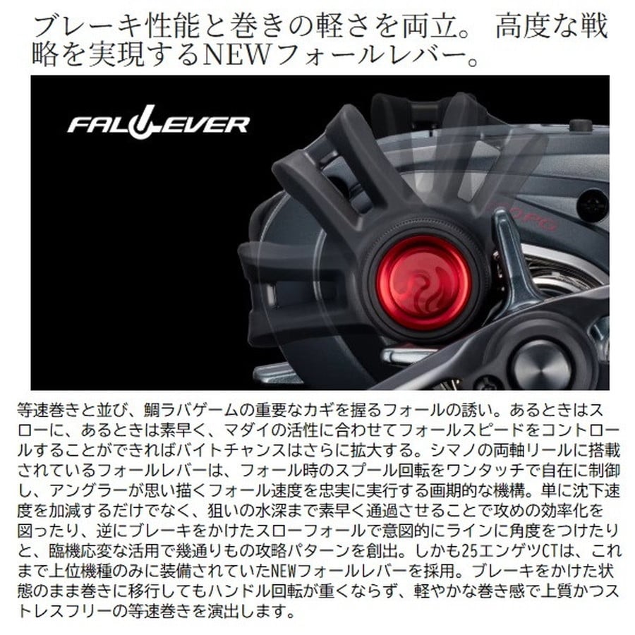 近海鯛ラバゲームをこの1台で。軽量・ロープロファイルのコンパクトボディに先進の機能を惜しげもなく搭載。エンゲツCTは、フォールレバーやデジタルカウンターといった高性能を手ごろな価格帯に凝縮したコストパフォーマンスが魅力。中上級者はもちろん、これから始める初級者にも鯛ラバゲームの醍醐味を存分に体感できる一台に仕上がっています。前作からの進化点は、ブレーキをかけてもハンドル回転が重くならない新型フォールレバーや、巻上距離アラーム機能が付いていっそう使いやすくなったインカウンターの搭載。さらにハンドルは51mmから55mmへとロング化して巻き上げの負担を軽減しつつ、巻き感度も両立。アップデートを行いながら、総重量は前作より約20g軽量化。ラインナップはHG、PGにそれぞれ右ハンドルと左ハンドルを展開。幅広いシチュエーションに対応可能な盤石のスペックで近海の鯛ラバゲームをフルカバーします。