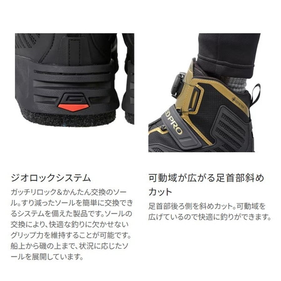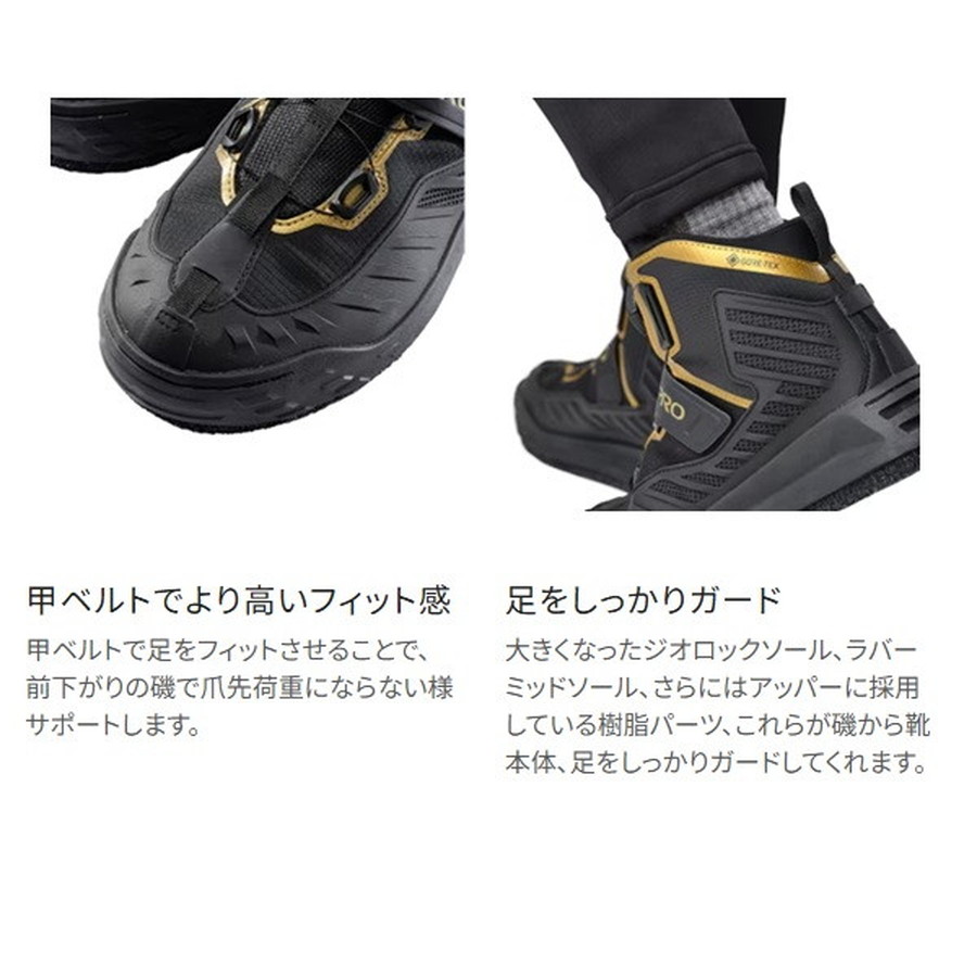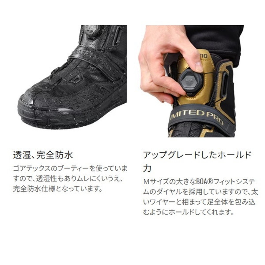 釣りに集中できるシューズを目指し、機能をイチから見直し再構築した磯シューズの最高峰、これがリミテッドプロ。全てにおいて新しくなったリミテッドプロシューズです。幅広甲高の足型を採用してフィット感が良くなっています。剛性を増したBOAフィットシステムが足全体を包み込むように締め上げ、今までにないフィット感が実現しました。定評のある甲ベルトが、足が前にズレることを抑え、前下がりの磯でも爪先の負荷を軽減してくれます。面積が大きくなったジオロックソールTypeAを採用することで複雑な地形の磯でもさらに安定性が向上しました。この結果、今まで以上に疲労しにくく安全に磯に立つことが可能になりました。完全防水と優れた透湿性能のゴアテックスブーティーを採用しハイエンドな仕上がりに磨きをかけ、荒ぶれる磯の上でも足元に一切気を使わず釣りに集中できるシューズになりました。