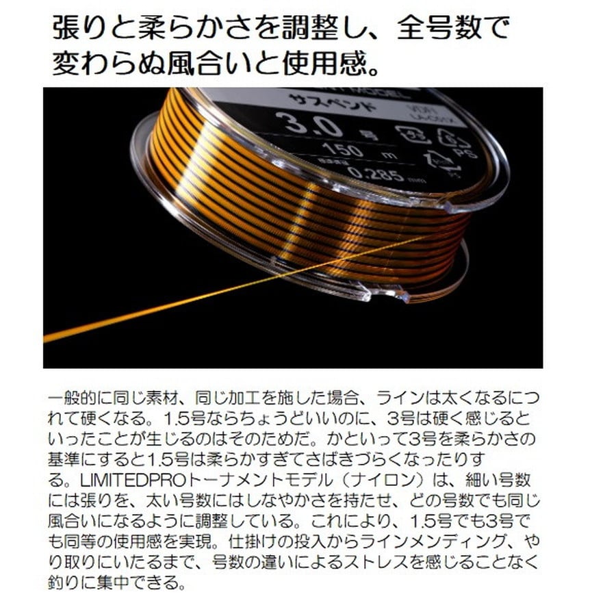 プラズマ処理により長く維持する理想の使用感。マキエとサシエが同調するように仕掛けを潮に乗せて流し込んでいくフカセ釣りでは、道糸の役目がとても重要だ。直線強力や結節強力といった釣り糸に求められる基本的な要素に加え、意図した通りに仕掛けを操作できる糸のさばきやすさと視認性が釣果を大きく左右する。LIMITEDPROトーナメントモデル(ナイロン)は、釣り糸表面を大気圧プラズマ処理することで、さばきやすさに直結する撥水性などフカセ釣りに適した特性に表面を改質。従来のコーティングに比べて初期性能を長く維持し、ストレスのない釣りを実現する。また、刻一刻と変わる天候や光量でも高い視認性を誇るオレンジ+紺色マーカー、並行巻き、絶妙な張りとしなやかさを兼ね備え細号数から太号数まで同等の使用感を実現するなど、ポテンシャルと使いやすさにこだわり抜いた仕上がりになっている。