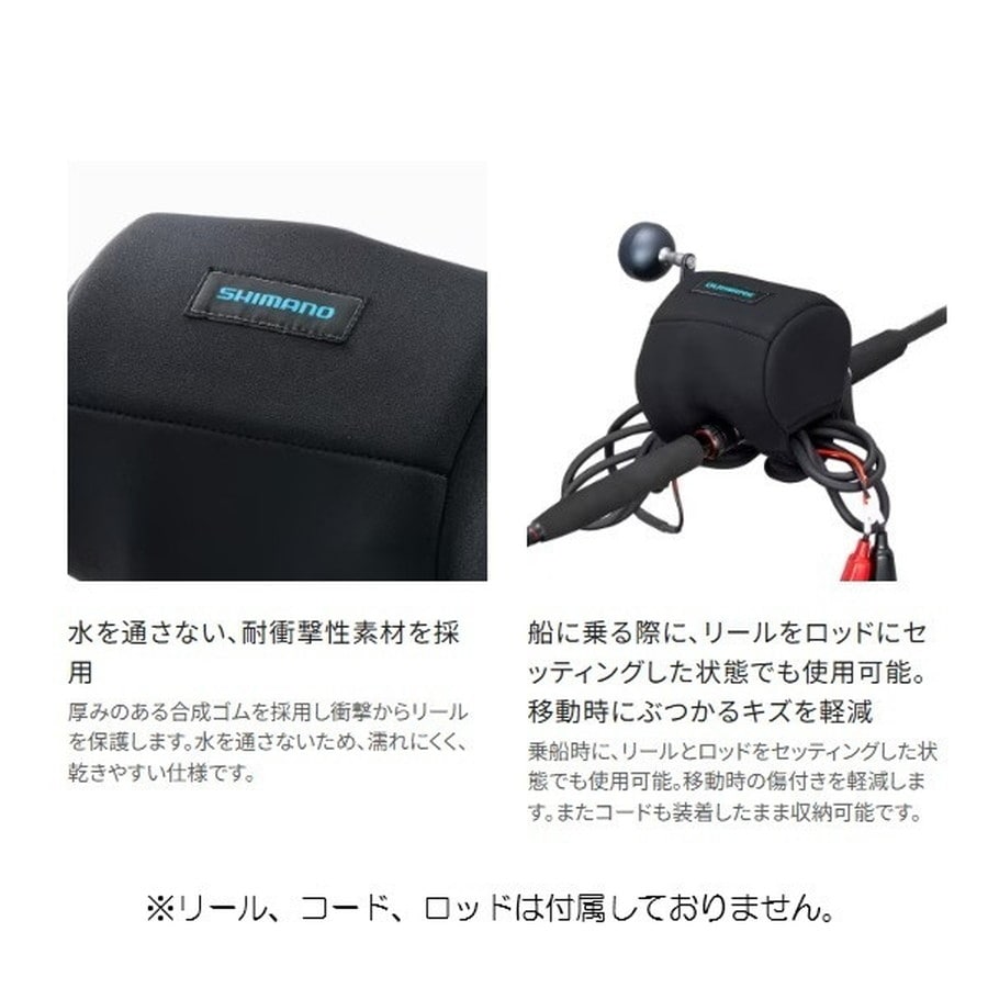 シマノ電動リールをしっかり保護する専用リールガード。シマノ電動リール専用リールガード。本体部には、耐衝撃性のある素材、カウンター部分にはハードボードを内蔵することで、リールへのキズや衝撃を軽減。リールにロッドをセットし、コードをつけたままでも装着可能です。