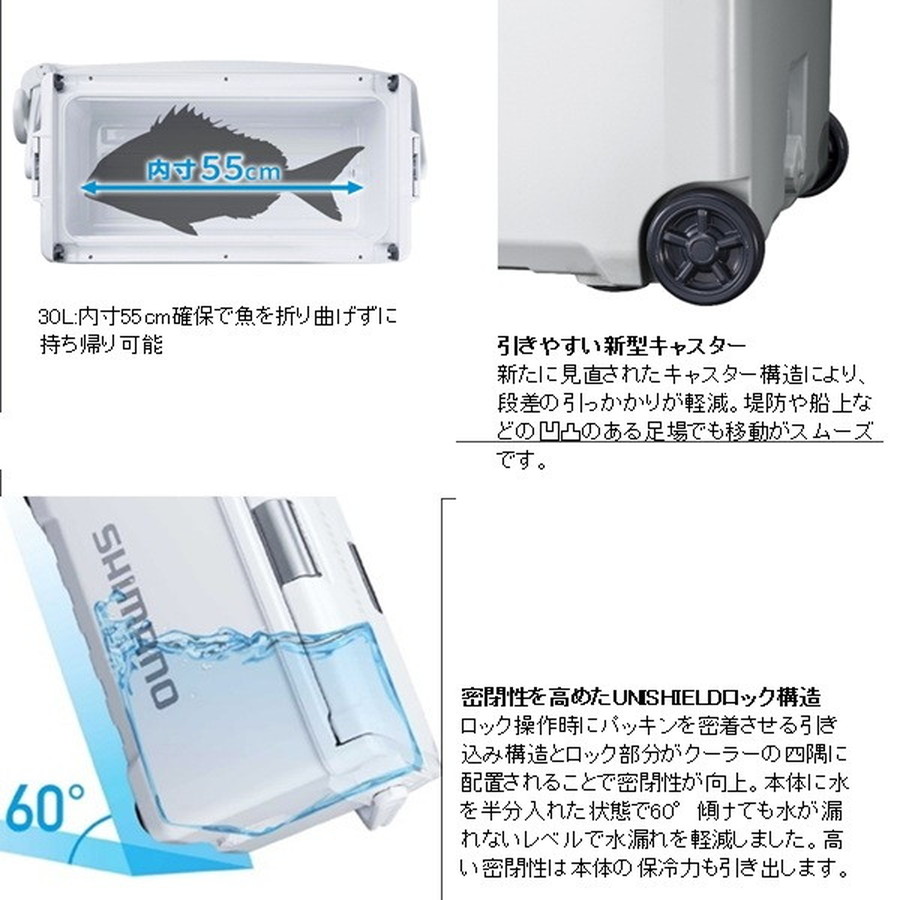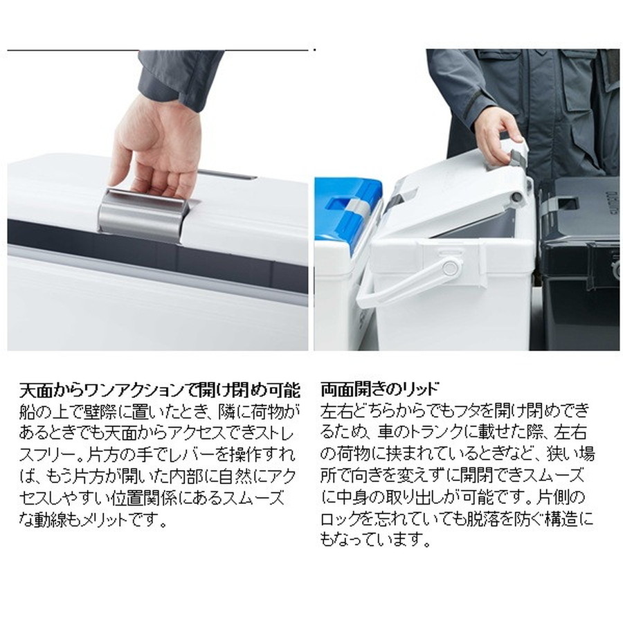 移動も収納も、釣行の「気が利く」相棒。魚を持ち帰ることを考えた新定番の釣り用クーラーボックスです。20Lは内寸45cmを確保、グッドサイズの魚を折り曲げずに持ち帰ることができます。30Lは内寸55cmを確保し、尺超えの魚も折り曲げずにそのまま収納でき、キャスター付きで移動もスムーズ。独自構造「UNISHIELD」により密閉性が高く、水漏れや冷気漏れを抑えやすくなっています。両面開きの蓋は、車内や船上の限られたスペースでも開閉しやすく、ワンタッチで開く跳ね上げ式水栓は使用後の水抜きも快適。底部に水が残りにくく、洗いやすさにも配慮されています。堤防釣りからインショアボート、船エサ釣りまで幅広く対応する、頼れるクーラーボックスです。