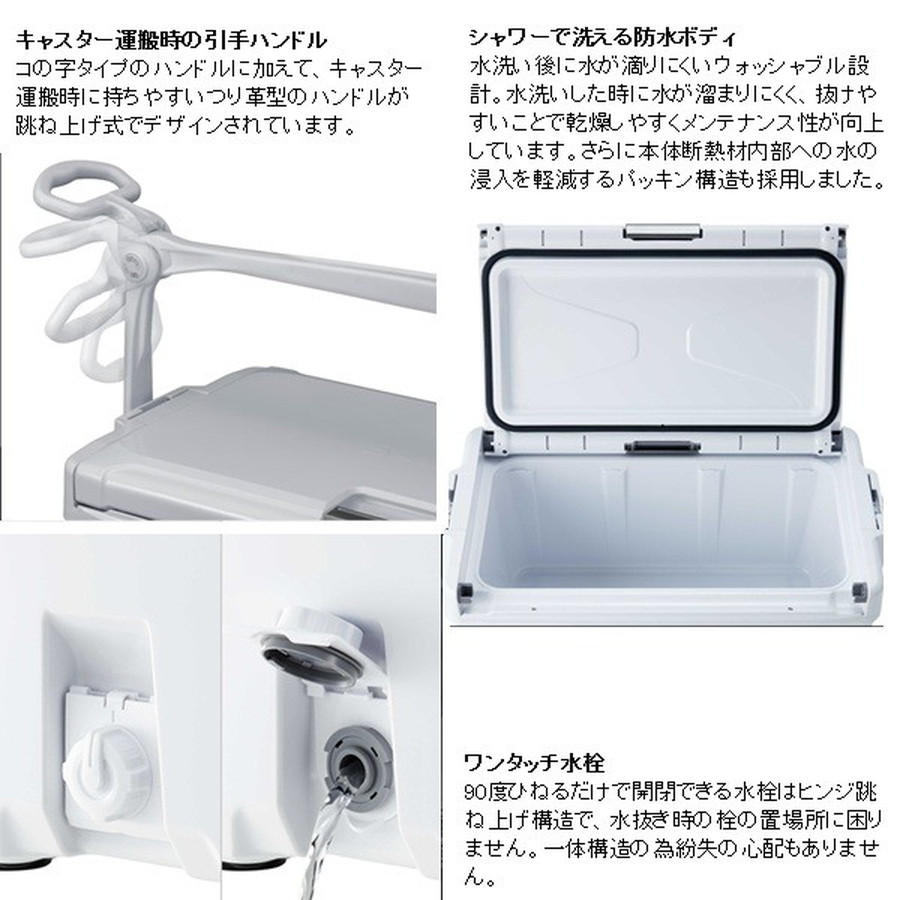 ※:クーラーの寸法は目安です。※外寸法にはハンドルを含みます。※底部の長さは、底面の角Rの中心と中心を結んだ長さです。※各シリーズの収納例は、板氷:130×240×65mm、保冷剤XL:195×255×35mm、オキアミ:170×300×60mm、飲物:PETボトル500ml Φ66×207mm、PETボトル2l 90×105×305mm、PETボトル1l 75×95×205mmを想定しています。※上蓋の断熱材は全て発泡ポリスチレンです。※クーラーの蓋の裏にある小さな穴は、内部の圧力を調整するための通気孔です。ご安心してお使いください。※蓋は防水構造ではありません。合わせ目に水をかけないでください。※水栓のナットが内側に部分的に突出しているところがあります。