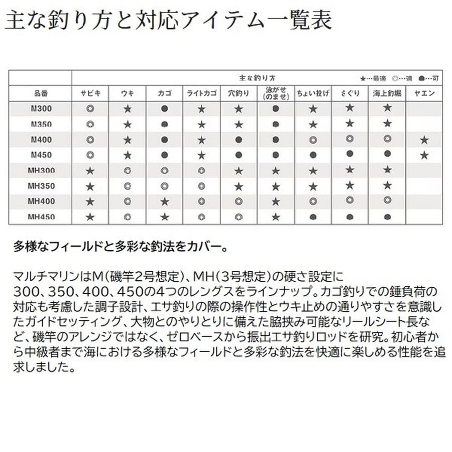 あらゆるエサ釣りに活躍!堤防・イカダ・海釣り公園・海上釣堀・船など場所を問わず、「エサ釣り」でのさまざまな魚たちとの出会いを愉しむためのマルチロッド。■MH300・・・MHパワー(磯竿3号相当)●ハリのある穂先で高感度を実現。●安心感のあるパワーでキャスト時の遠投性能とスムーズなファイトをアシスト。●3mレングス(シリーズで最も全長が短いため、持ち軽く、軽量。快適な操作性を実現。)