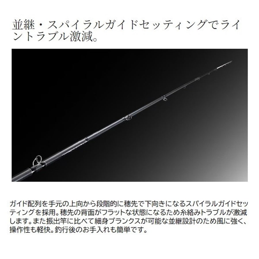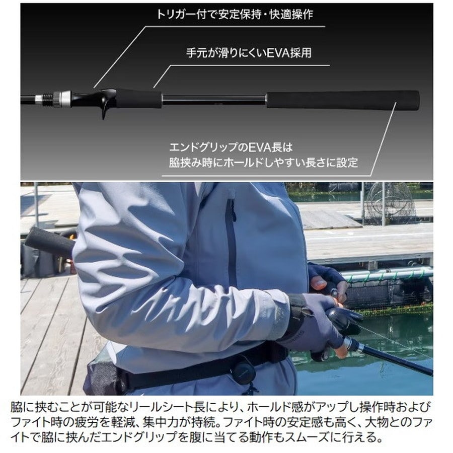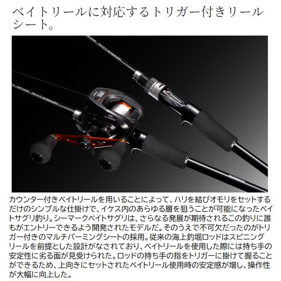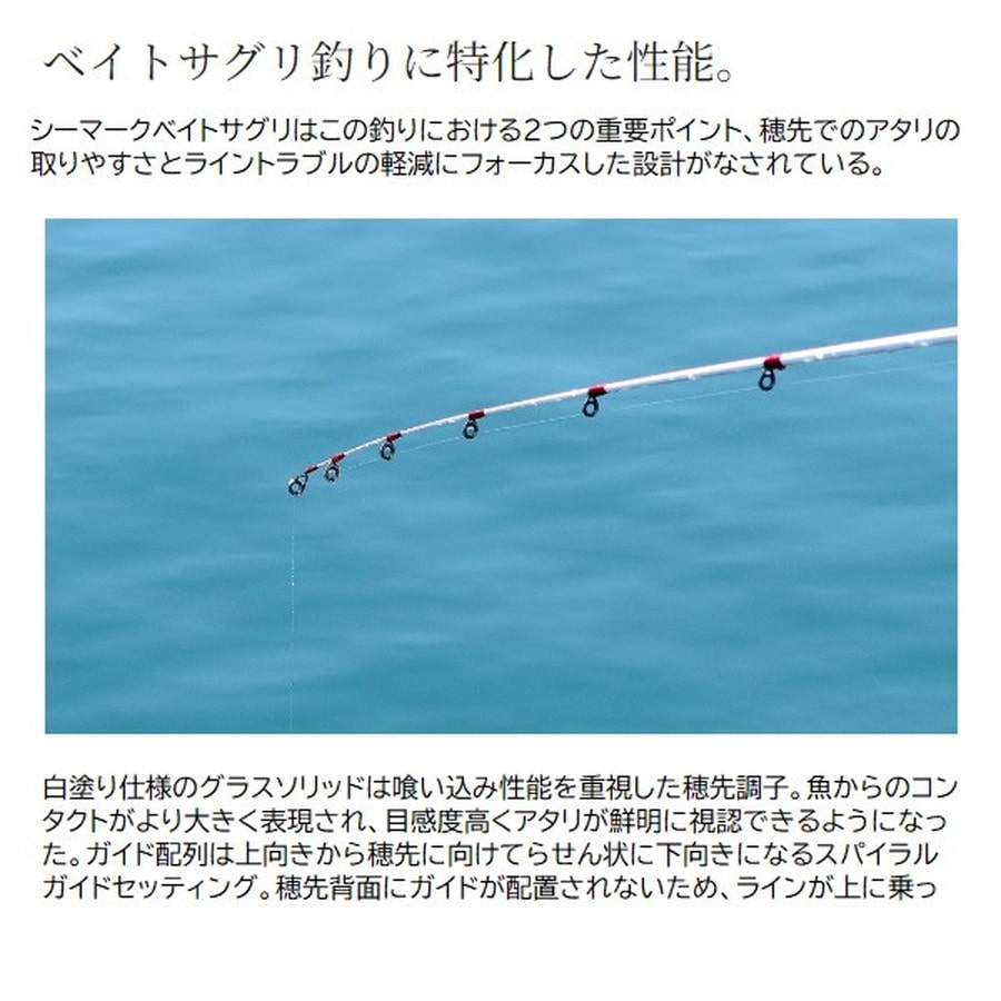 カウンター付きベイトリールを用いたサグリ釣りの理想を追求したベイトサグリロッドのベーシックモデル。海上釣堀におけるベイトサグリ釣法、そのエントリーに最適なベーシックモデル。釣れるタナが明確に分かるカウンター付きベイトリール専用設計で、トリガー付きリールシートによりダイレクトな操作が可能に。グラスソリッド穂先はアタリが取りやすく目感度に優れた白塗り仕様。独自の並継・スパイラルガイドセッティングの採用で、軽い仕掛けを使用するこの釣りの糸絡みトラブルが激減。また、一般的な振出仕様の海上釣堀ロッドでは実現が困難な細身のブランクスは、強風の日でも操作が軽快。シート周りおよびグリップエンドはEVA製で持ちやすく滑りにくい。リールシート長も脇に挟みやすい長さに設定したことで、操作時の疲労を軽減し、ファイト時の安定性も向上。ブランクスはMパワー相当でマダイから中型青物まで対応が可能。