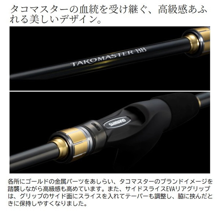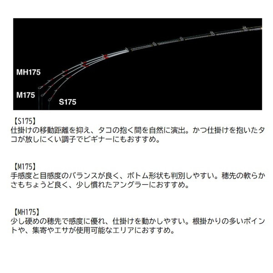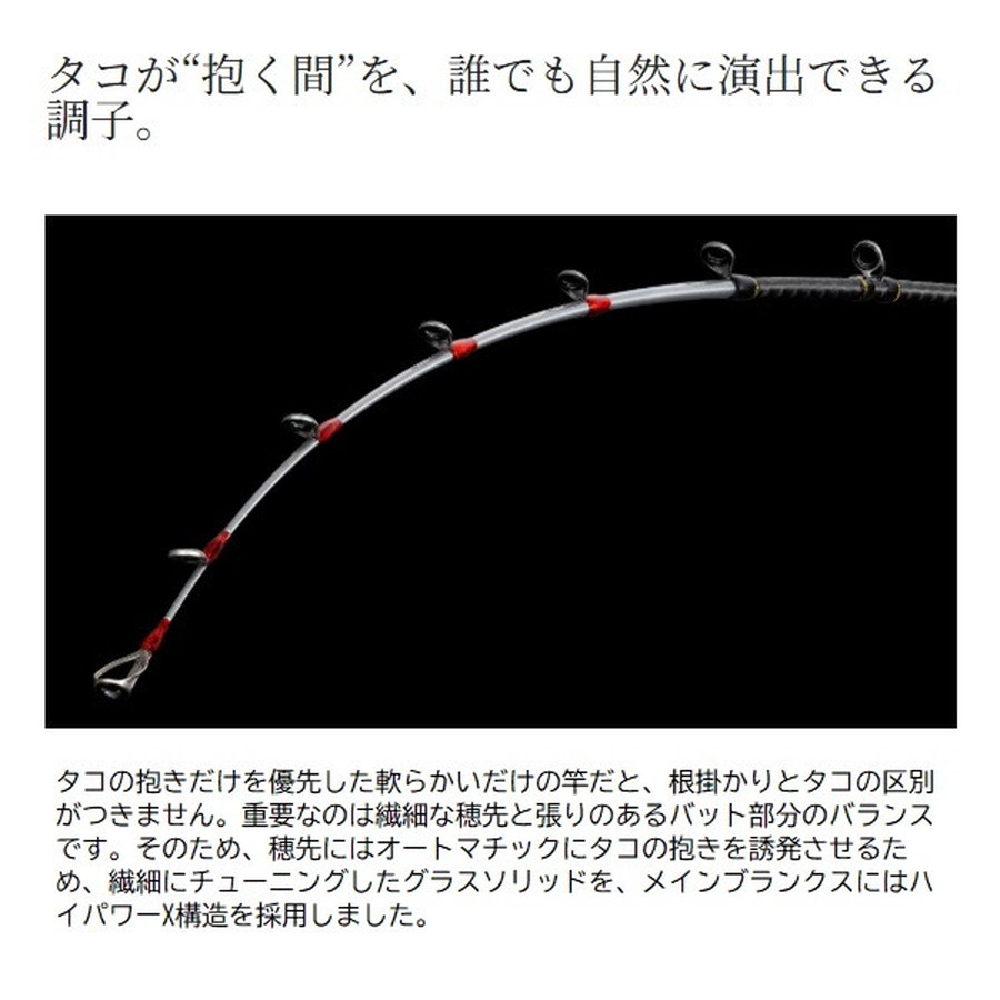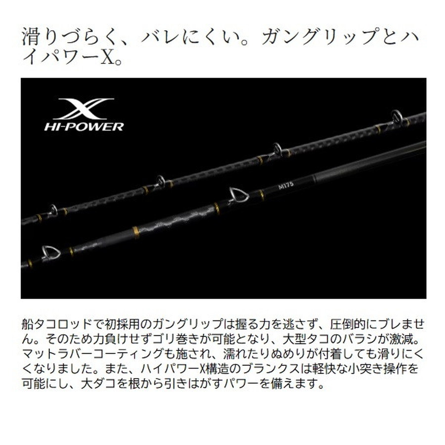 誰もが認める本気のBB。船タコ攻略をより深く、高次元に。船タコ釣りの楽しさ・ゲーム性を追求するタコマスターシリーズにタコマスターBBが登場。軽量でネジレに強いハイパワーX構造のブランクスにより、軽快な小突き操作を可能にし、大ダコを根から引きはがすパワーを備えました。また、穂先にはオートマチックにタコの抱きを誘発させるため、柔軟にチューニングしたグラスソリッドを採用。さらにリールシートにはシリーズ初となるXシート デュアルガングリップを搭載。それにより一日を通して楽に誘い操作が可能になるだけでなく、フッキングパワーの向上や、ファイト時のブレ低減によるバラシの減少にも貢献します。ベテランからビギナーまでを唸らせる、そんな竿が誕生しました。■MH175・・・集寄や発光体といった水中抵抗の大きいハイアピール仕掛への対応力を磨いたアイテム。早潮での深場や、根掛かりの激しい荒根狙いにも威力を発揮。