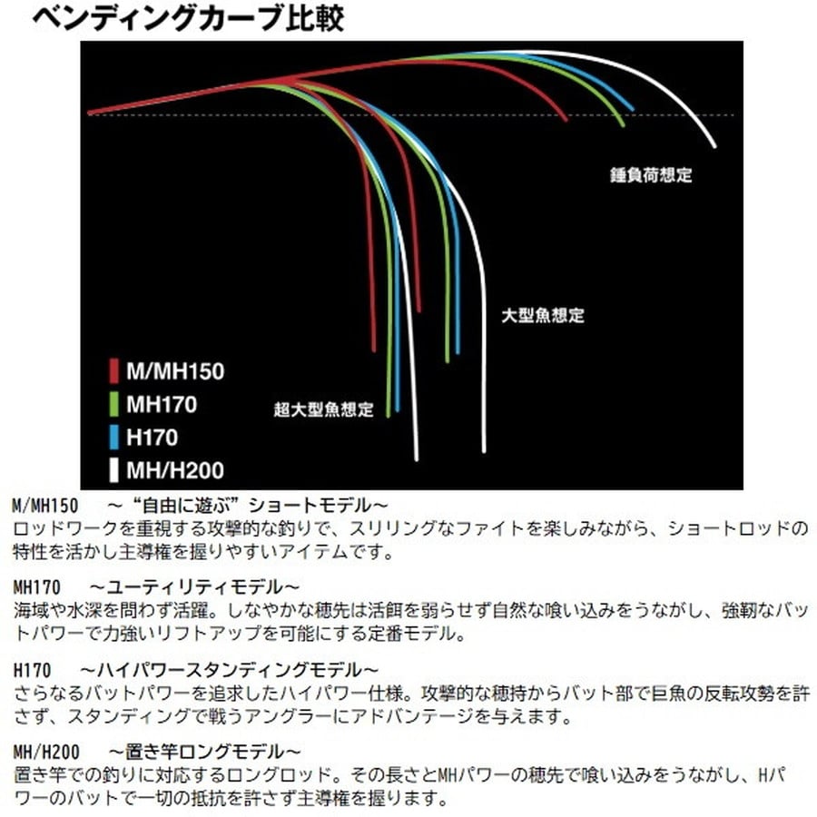 手にして優越。獲る力で圧倒。「頂」を目指す2ピース。まだ見ぬ夢の大物に想いを馳せる泳がせ釣り。一生に一度の怪物と対峙した際、臆することなく曲げ込めるブランクスを目指しアルシエラ泳がせが登場。■MH/H200・・・置き竿ロングモデル。置き竿での使用を主眼に置いたロングレングス。アイテム名の表す通り、MHパワーの穂先で置き竿時の喰い込みを促し、Hパワーのバットで主導権を握り、一切の抵抗を許さない。