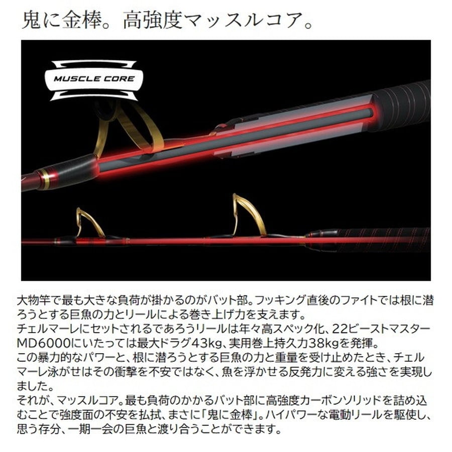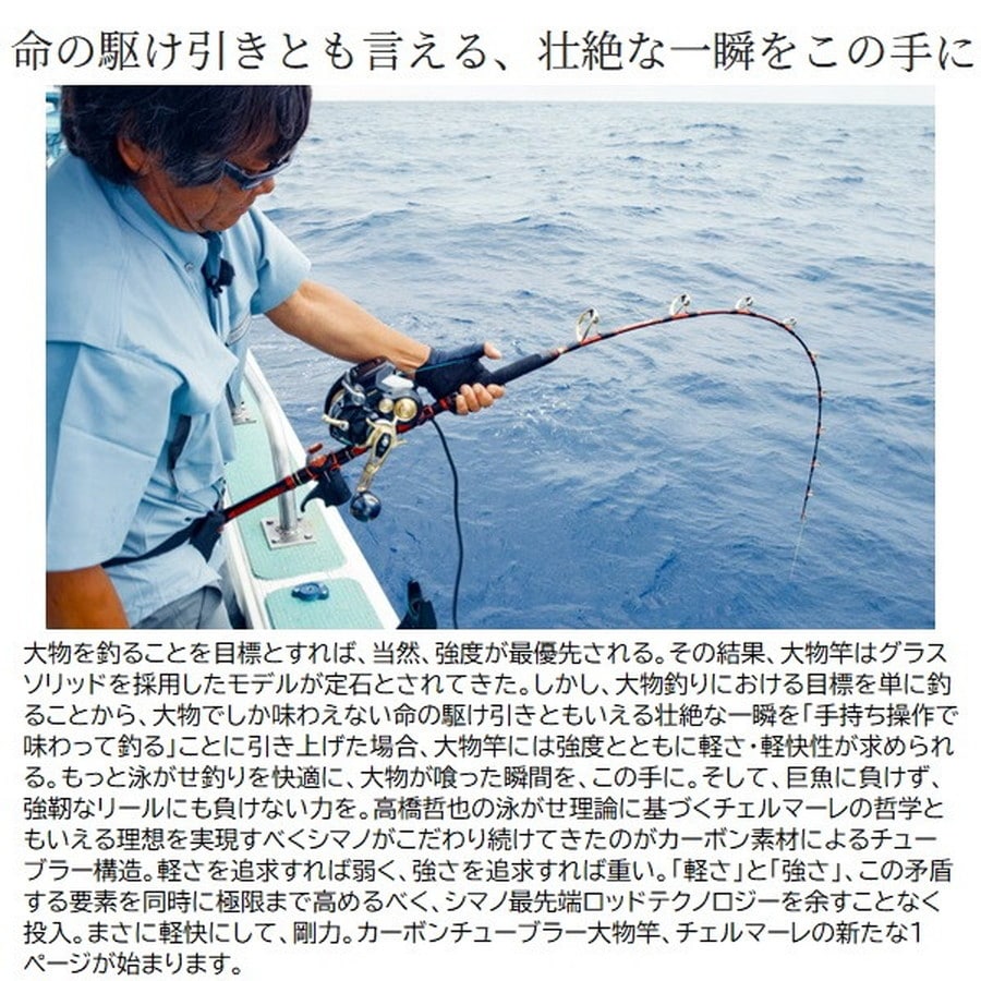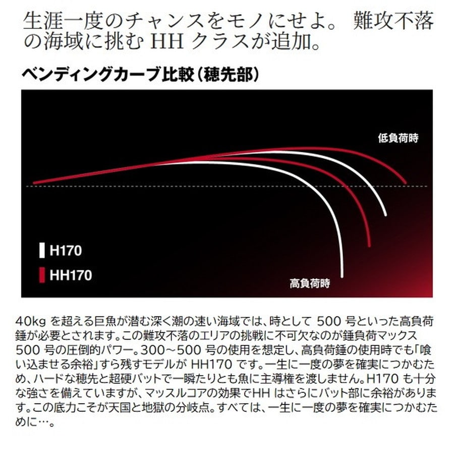 強さのその先へ。唯一無二の超高強度を追求した新生チェルマーレ。大物竿において強いことは大前提。チェルマーレは強さに加え、操作性と感度を愚直に追い求めてきた。巨魚と対峙した際の一瞬ともいえる命の駆け引きを手持ち操作で味わっていただくためには、軽量で高強度なカーボン素材およびチューブラー構造が欠かせない。活餌が追われ暴れ出した瞬間の高揚感・穂先がアタリを捉えアワセを入れるまでの緊張感・掛かった獲物の突っ込みを止める際の全てを忘れるあの感覚を…。いかなる瞬間もチェルマーレであり続けるために。ブランクスを徹底的に鍛え上げ、最も負荷のかかるバット部にはカーボンのコア材で強化し、過剰なまでの高強度化を施した。新生チェルマーレはただ強いだけでも、ただ軽いだけでもない。大物釣りの神髄を追求した結果がここにある。■HH170・・・H170からバット部のパワー向上と、穂先部に張りを持たせるようチューニング。難攻不落の海域への対応力が向上。全ては一生に一度のチャンスをつかむために。
