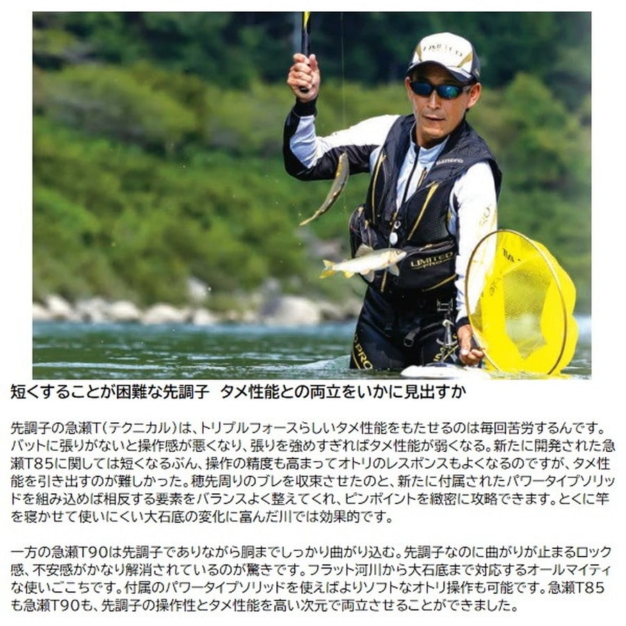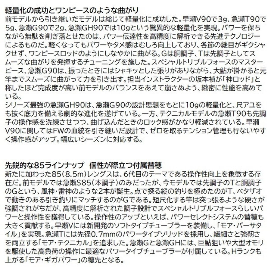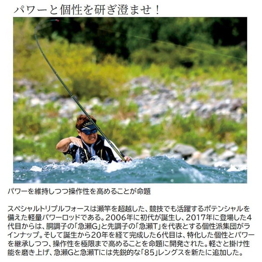 入れ掛かりをもたらす戦略的パワーロッド!個性さらに極まる。6代目スペシャルトリプルフォース。大鮎&瀬釣りで入れ掛かりをもたらすロッドとして、パワーだけでなく軽さや操作性のバランスも徹底重視。さらに数々のテストと釣果から導き出された専用設計を施し、各アイテムの特性にさらに磨きがかかる。