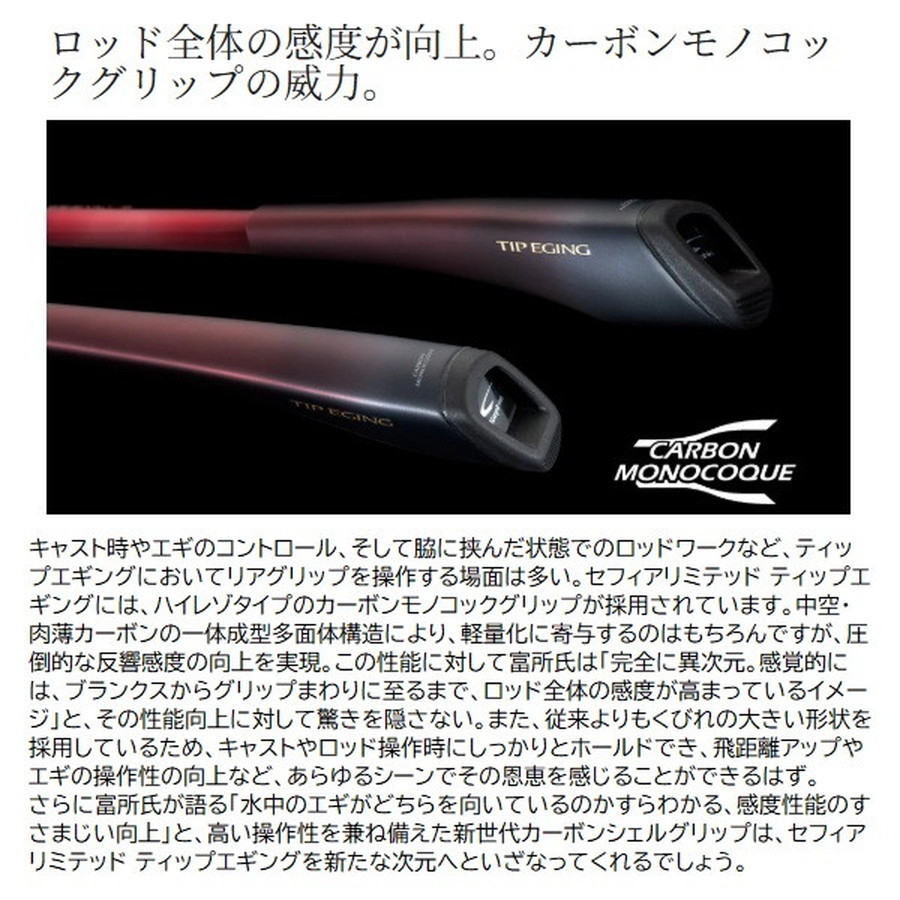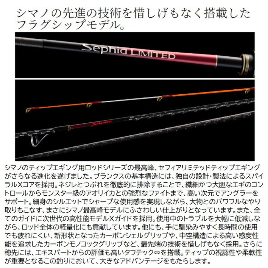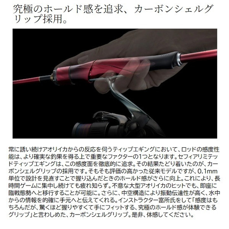 圧倒的なパフォーマンスを追求し、エキスパートの高い要求に応える。さらなる高みを求めるアングラーのための、シマノ最高峰ロッド。■S610L-S・・・ロングレングスかつしなやかなライトパワーというブランクス特性を持つため、荒れたコンディション下でも波の揺れをしっかりと吸収。安定感のあるエギ操作が行えます。また、ターゲットの活性が低く、繊細なアプローチが求められるような状況においても、アオリイカに違和感を与えず誘うことが可能。低活性な個体からの微細な反応も、ティップでしっかりと感知し、釣果へとつなげることができるモデルです。