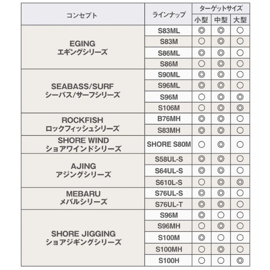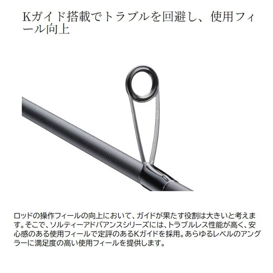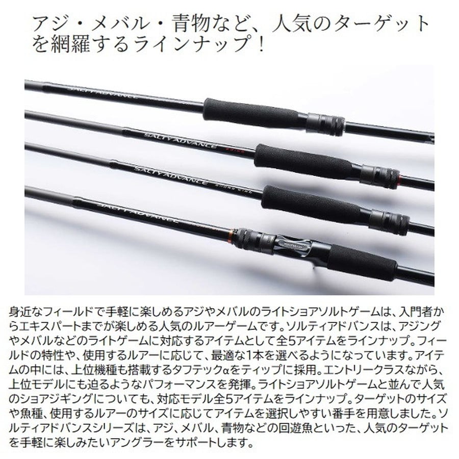 あらゆるショアゲームに対応するハイコストパフォーマンスシリーズ。可能性を広げる充実のラインナップでアングラーをサポート。「もっと手軽にソルトルアーゲームを楽しみたい!」そんな気持ちに応える、ハイコストパフォーマンスロッド、ソルティアドンバンスシリーズに追加モデルが登場。■SHORE JIGGING S100H・・・MAX100gクラスのジグの安定したキャストを支え、大型青物の走りを受け止めるヘビースペック