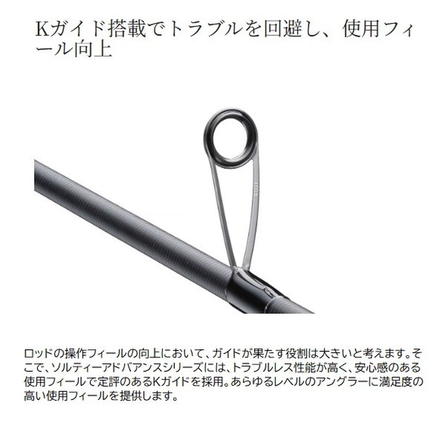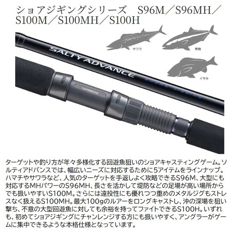 あらゆるショアゲームに対応するハイコストパフォーマンスシリーズ。可能性を広げる充実のラインナップでアングラーをサポート。「もっと手軽にソルトルアーゲームを楽しみたい!」そんな気持ちに応える、ハイコストパフォーマンスロッド、ソルティアドンバンスシリーズに追加モデルが登場。既存の幅広いラインナップに加えて、身近なフィールドで狙えるアジやメバルなどのショアソルトゲームから、青物やサワラがターゲットのブレードジギングまで、人気の釣りに対応するモデルを新たにラインナップ。上位機種ゆずりの高い性能や高品質パーツの採用、洗練されたデザインなどにより、クラスを超えたパフォーマンスを発揮します。各アイテムがターゲット別にラインナップされているので、様々な魚種を楽しみたい、というアングラーが、タックルを複数準備したい場合も揃えやすくなっています。また、上位モデルにも迫るような軽くてシャープな使用感を実現。幅広いアングラーに使っていただけるような、扱いやすくハイパフォーマンスなロッドに仕上がりました。