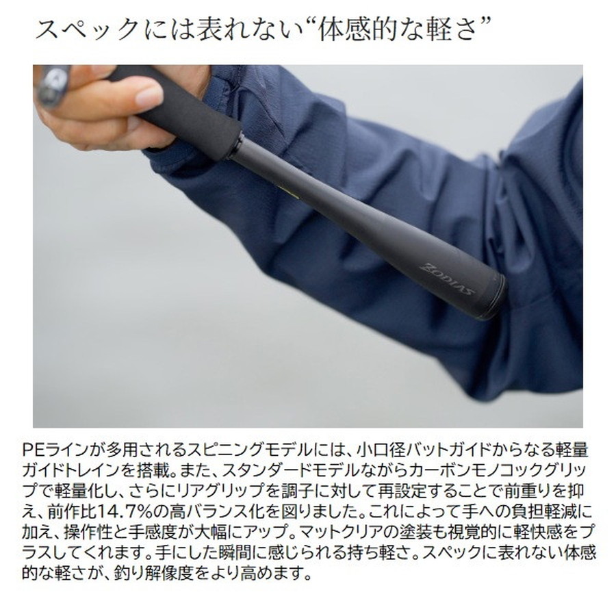 響きわたる感度、加速する操作性。世界が認めた本物の風格。世界中のフィールドで鍛えられたゾディアスが、さらなる実釣性能の向上を目指してアップデートしました。軽快な操作感をもたらす高バランス設計、キャスト精度とパワー伝達を高めるハイパワーX構造。そして、水中の変化を明確に伝えるカーボンモノコックグリップ。それぞれの要素を丁寧に見直し、より高い次元で融合させることで、現代のバスフィッシングロッドに求められる完成度へと磨きを掛けました。基本性能を愚直なまでに追求し、あらゆる状況に応える、信頼の一本がここにあります。■274ML-2・・・VERSATILE。状況に応じた多岐にわたるアプローチをアングラーに提供するバーサタイルモデル。