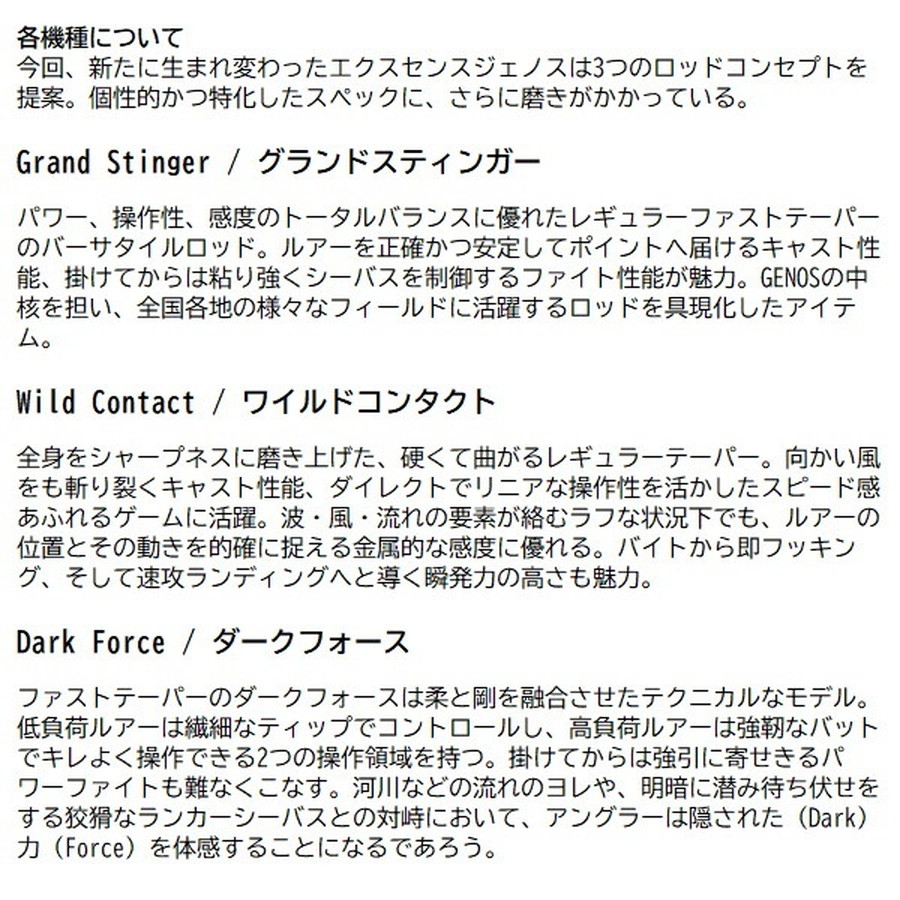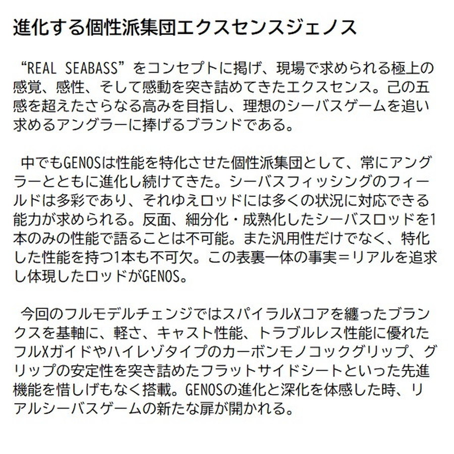 基本性能の進化、研ぎ澄まされる個々の戦闘能力。REAL SEABASSをコンセプトに掲げ、シーバスゲームにおける感覚・感性・感動からなる「究極の感」を追求してきた個性派集団「エクスセンスジェノス」がさらなる進化を遂げた。軽くて強いブランクスを実現するスパイラルXコアを基軸に、シマノが持ちうる先進テクノロジーによって基本性能をブラッシュアップ。すべてのガイドはシマノオリジナルとなるフルXガイド仕様。軽さに優れ、ブランクス本来の性能をこれまで以上に引き出すことに成功した。また、持ち軽く・振り軽く、あらゆるシーンにおいて高精度の操作性を実現。さらにラインのトラブルレス性能も向上し、一瞬のチャンスを逃さずシーバスを手にする確率もアップ。