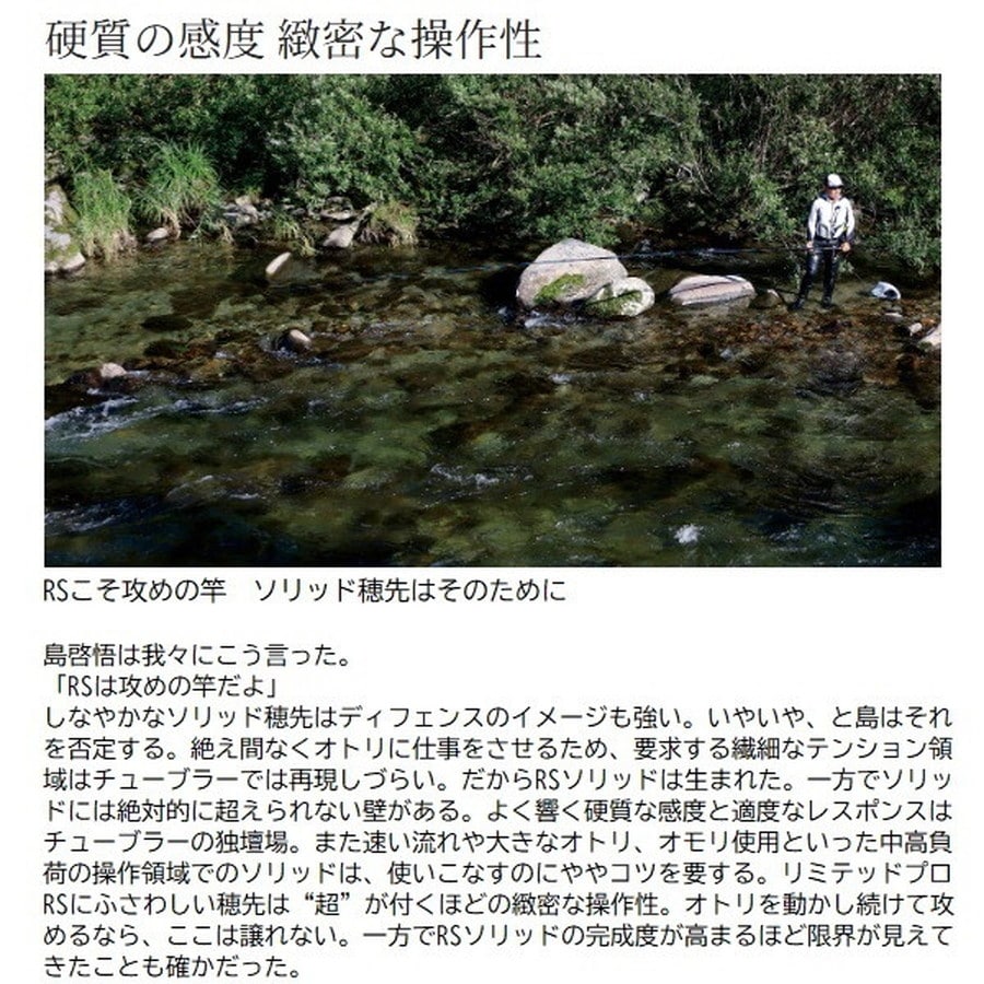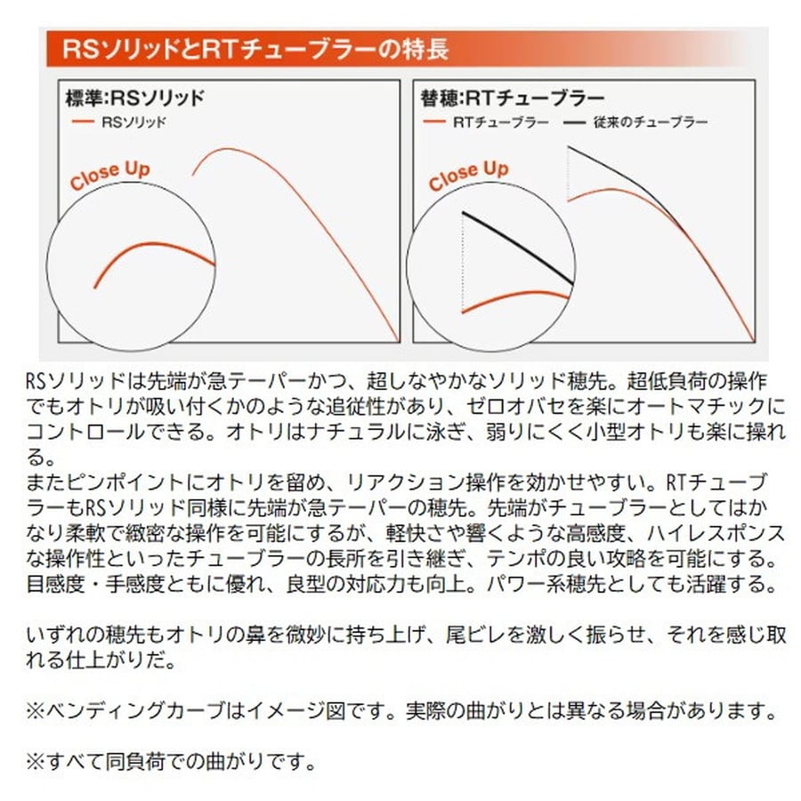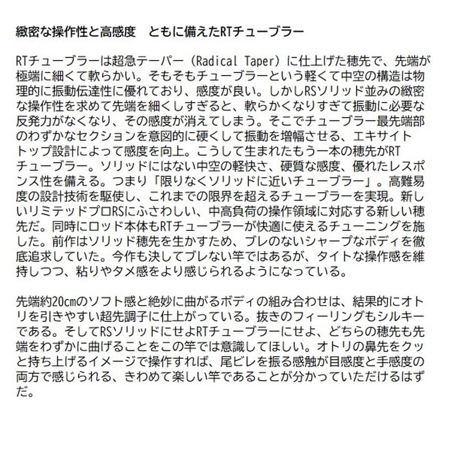リミテッドプロRSに禁断RTチューブラー替穂搭載。ソリッド&チューブラーの極限的操作。5代目リミテッドプロRSにして禁断RTチューブラー登場。「RT=ラディカルテーパーチューブラー」はチューブラー設計の限界を超えた究極的な超先調子、極限の操作を可能に。RSソリッドとRTチューブラー、どちらの穂先にも対応する通用する高バランスボディを採用。RTチューブラーは先だけが極端に曲がる超急テーパーで仕上げた超先調子。積極的に感じて操るチューブラー特有の感度・レスポンス・軽快性を備えつつ、ソリッドに迫る緻密な操作性+オバセ管理が可能。RSソリッドはイージーゼロ管理。ソリッドの線先端だけがしなやかに曲がり、低負荷時においても高精度の操作を得意とし、オトリの泳ぎを最大限に引き出す。オトリに優しいだけでなく、攻撃的に尻尾を振らせる泳ぎも生み出す。
