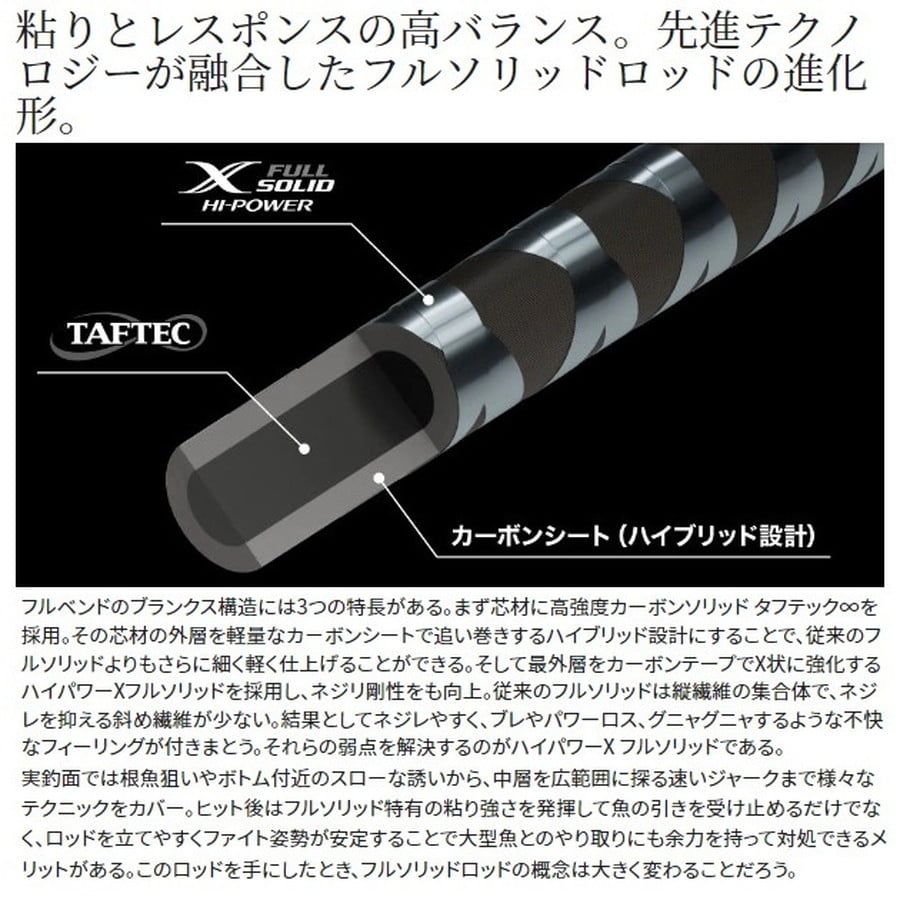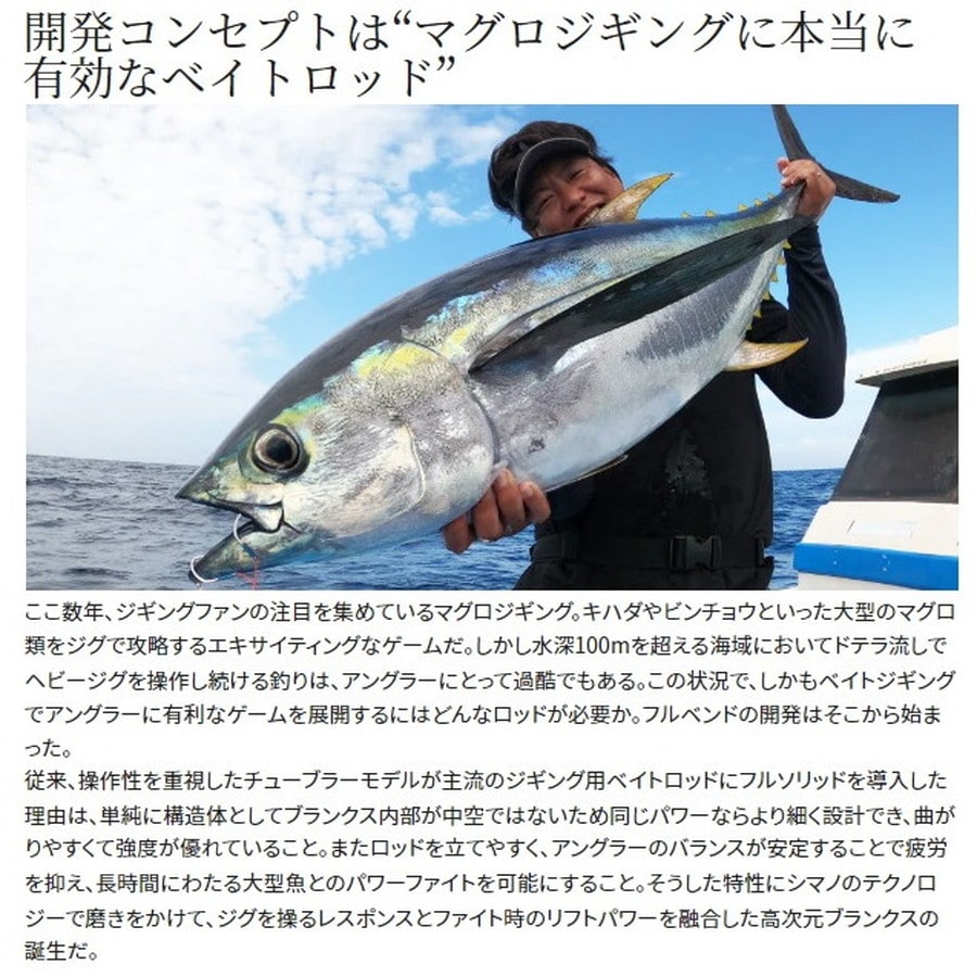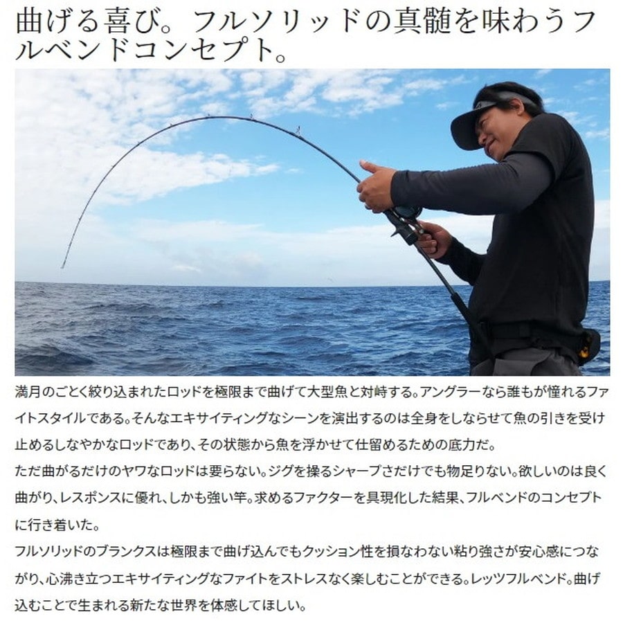 豪快に曲げて真っ向勝負!フルソリッドの粘りに反発力をプラス。■B60-5・・・シリーズ最強。大型魚と対峙するヘビースペック。適合ジグウェイトMAX400g、水深は速い誘いで150m+α、遅い誘いで240m+αに対応。シリーズ中で最もパワーのある5パワーは、外洋の中層をミドル~ハイスピードのワンピッチジャークで探ったり、200m以深の中深海をスローに誘ったりするためのヘビー仕様。それでいてアングラーの負担は少なく、ジグ操作をリニアに行うためのレスポンスも兼備している。ターゲットは青物で20kg超、マグロ類では50kg超までを想定。適合リールサイズは2000~4000番。