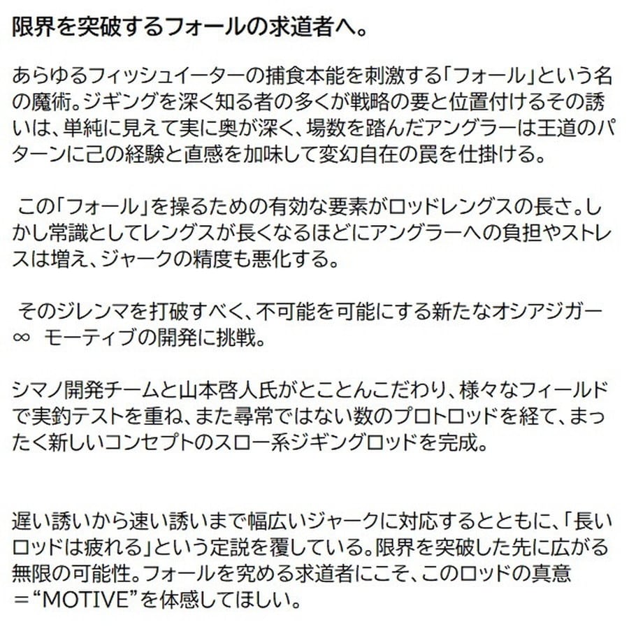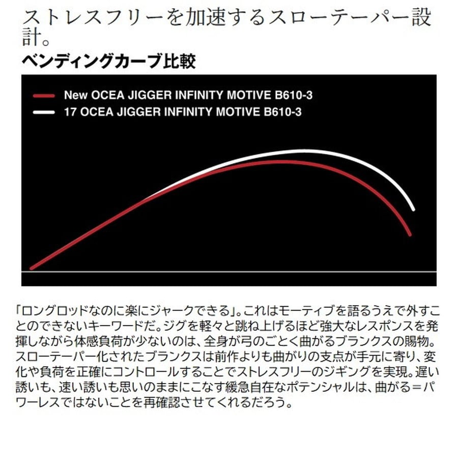 もっと軽やかに、もっと変幻自在に、そして強く。多彩なジグアクションを演出するロングレングスの雄。青物・中深海・トンジギなど、最先端のジギングシーンにおいて存在が際立つスロー系ロングロッド。その先駆けとして、長さと操作性のベストバランスにこだわってきたオシアジガー∞ モーティブが、さらなる進化を遂げてリニューアル。■B610-4・・・大型魚も視野に入れたパワー系バーサタイル。●参考水深:速い誘い ~140m+α、遅い誘い ~300m+α ●ジグウェイト140~350gに対応 ●適合リールサイズ:1000~3000番