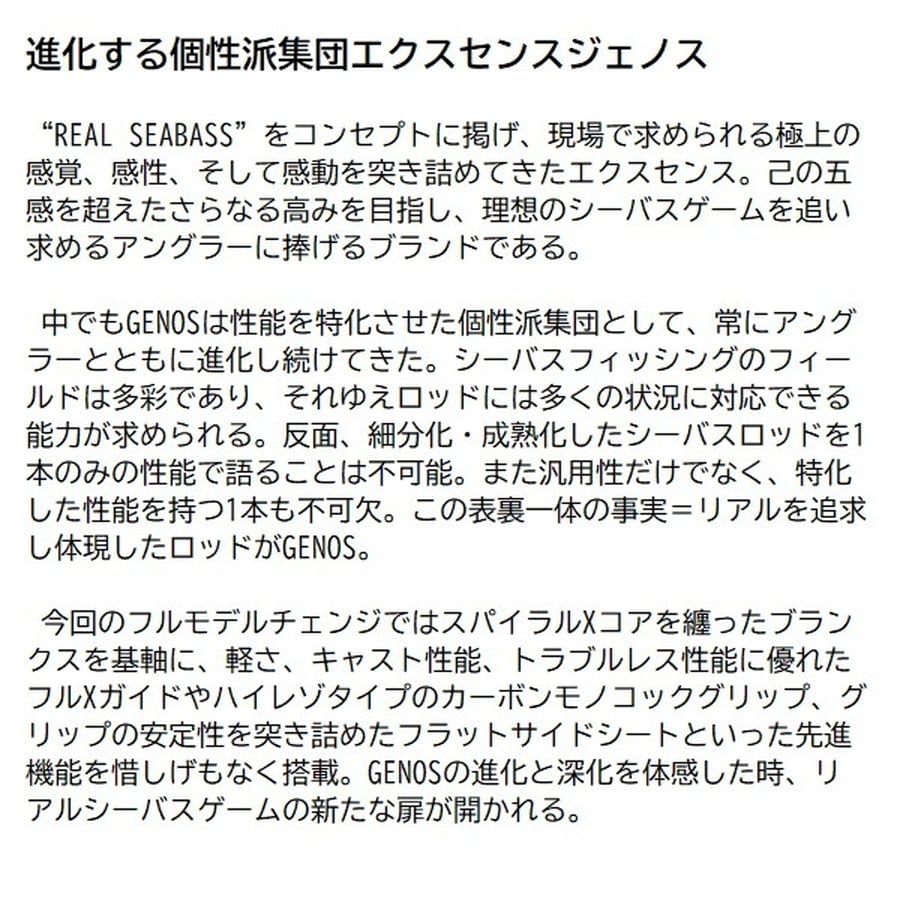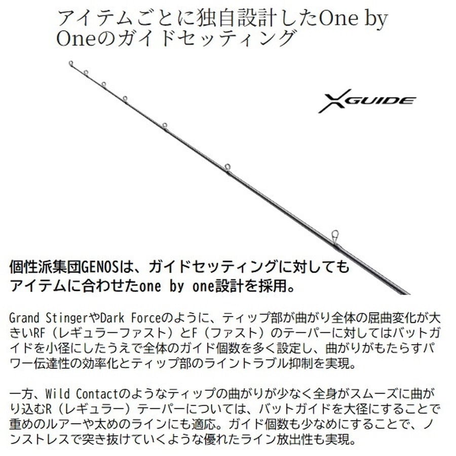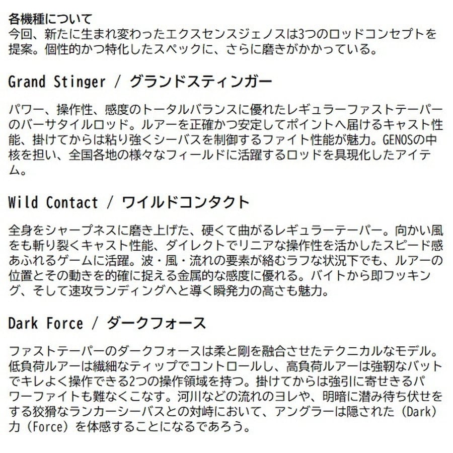 REAL SEABASSをコンセプトに掲げ、シーバスゲームにおける感覚・感性・感動からなる「究極の感」を追求してきた個性派集団「エクスセンスジェノス」がさらなる進化を遂げた。■Wild Contact 100・・・遠投性能を高め、広大なフィールド攻略を重視した「Wild Contact 100」。ブランクス全身がシャープかつ硬質でありながら、一瞬の変化やタイミングを把握するための絶妙な曲がりに磨きがかかった“硬くて曲がる“超攻撃的ロッド。向かい風をも切り裂くキャスト性能、少ないモーションでルアーを緻密に操れるリニアな操作性、水中にあるルアーが今どんな状態なのかを鮮明に伝える感度、バイトがあれば速攻でフッキングを決めてスピーディーに引き寄せられる瞬発的なパワーなど、あらゆる攻めの動作をサポート。計算されたロッドの”硬さ”は曲げ込むほどに強大な反発力を発揮し、10’0”レングスの常識を凌駕する大遠投を可能にする